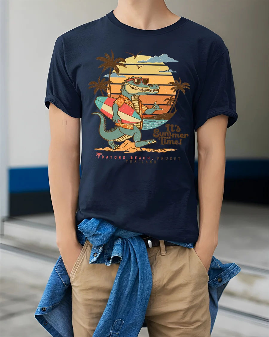 Designed with a nostalgic summer aesthetic, this crocodile graphic tee combines vintage style elements with modern artistic clarity to create a balanced and eye catching look. The colorful composition highlights tropical scenery and relaxed beach personality, making the design visually engaging while maintaining a casual and versatile appearance. The playful reptile artwork adds humor and charm that enhances everyday style.