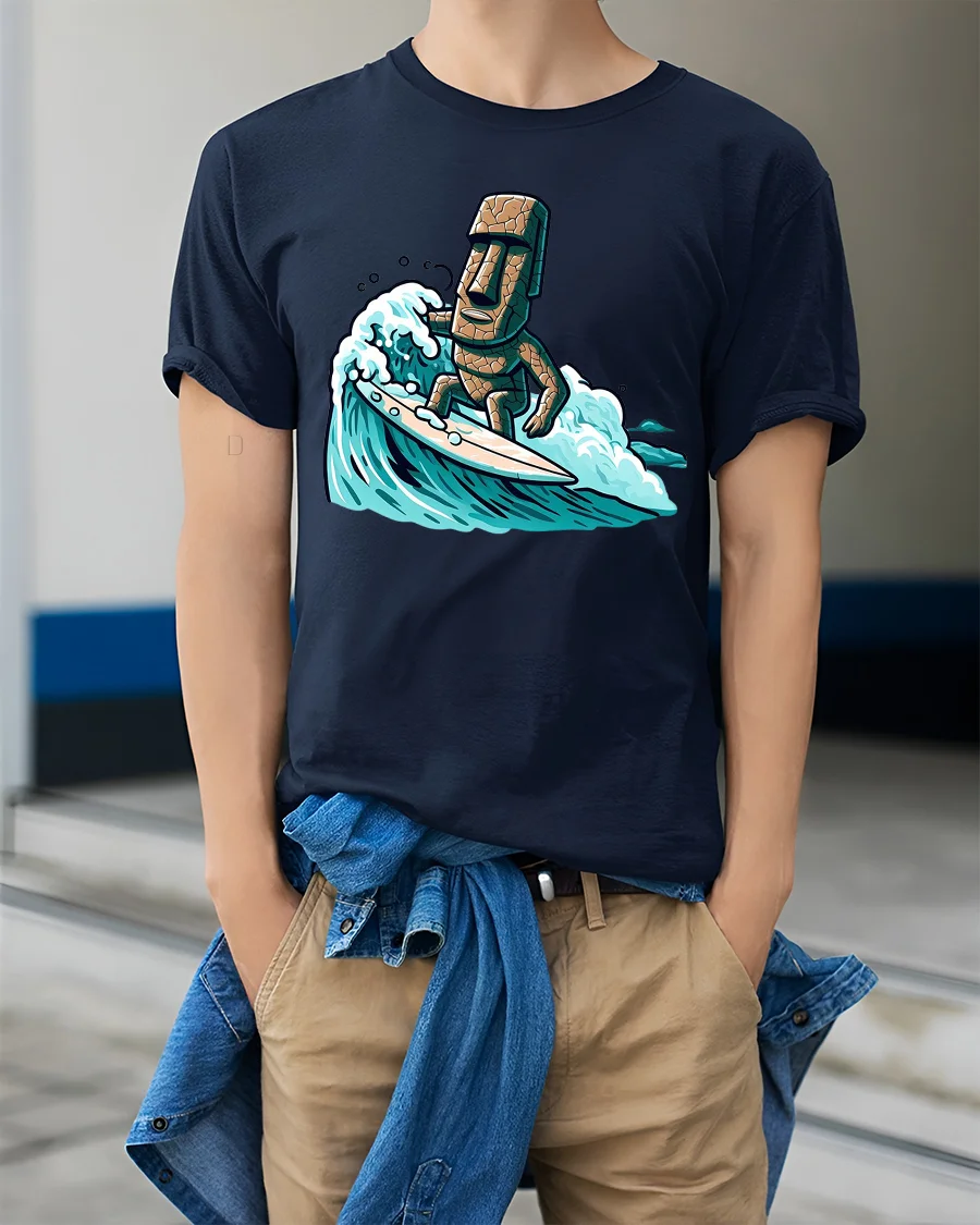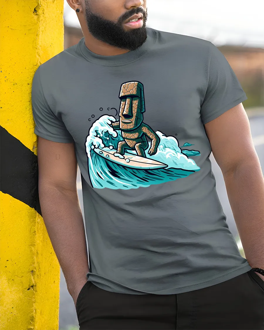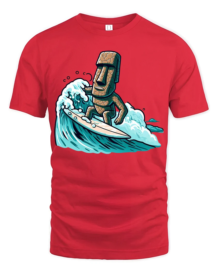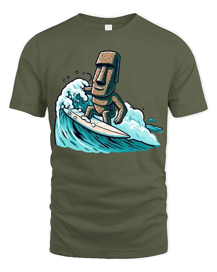 Funny Surfing Moai Statue Graphic Tee Retro Beach Humor Style combines island inspiration with playful creativity in a unique ocean themed illustration.