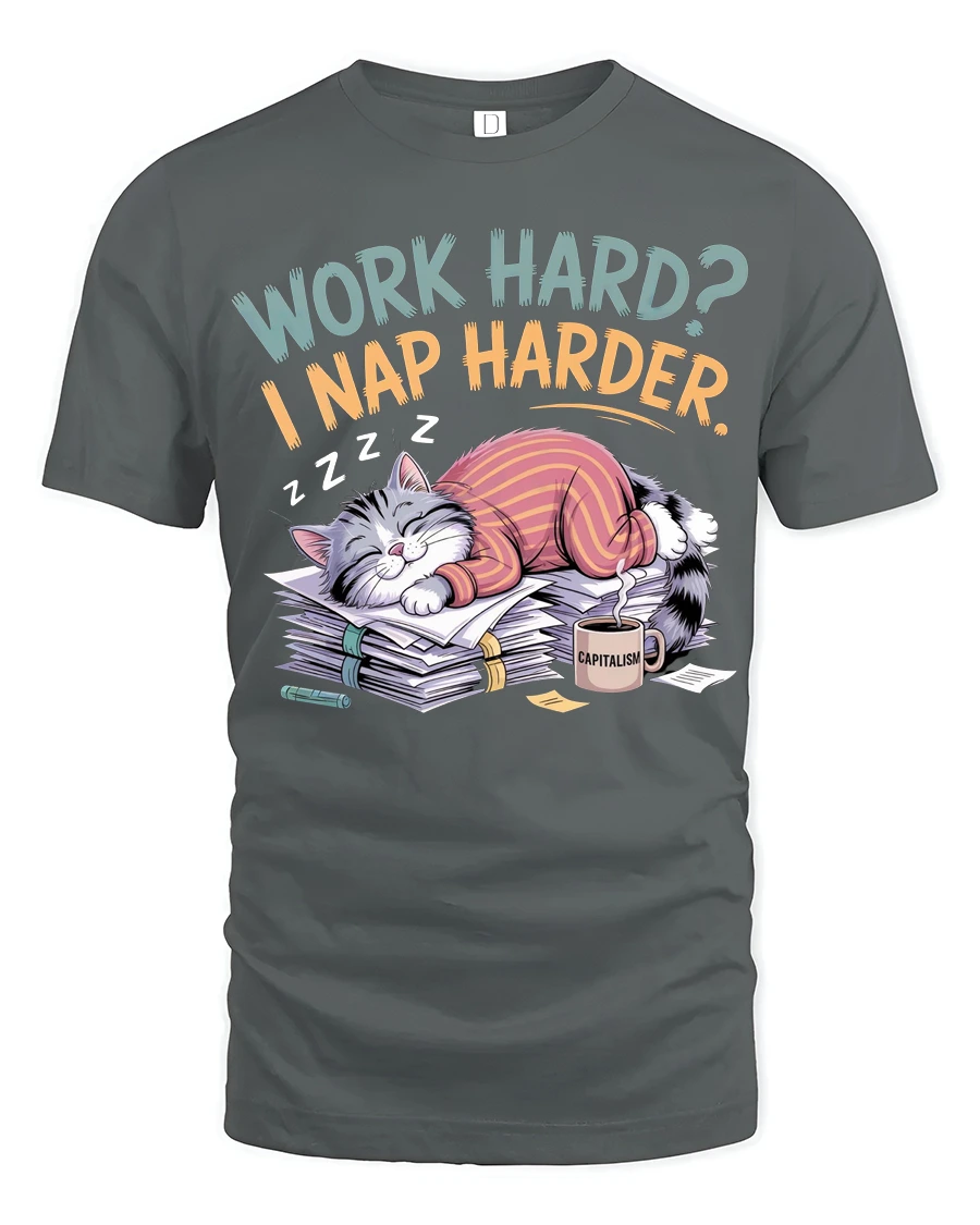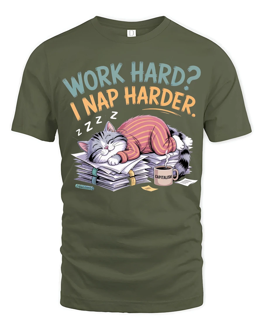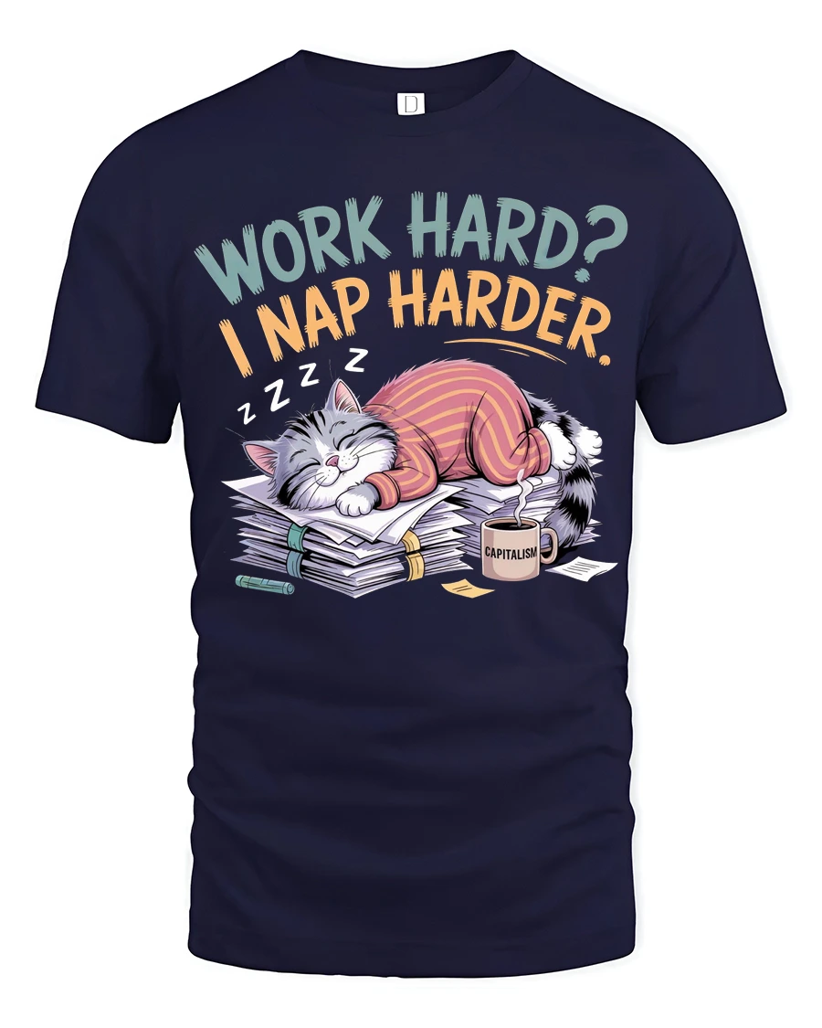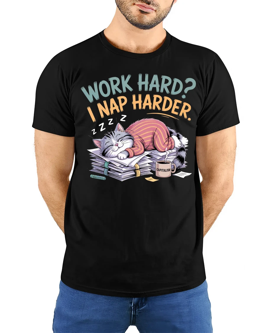 Funny Work Hard Nap Harder Cat Graphic T Shirt Lazy Humor brings a playful twist to everyday work life with a cute and relatable design.