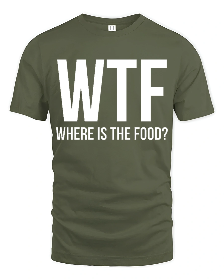 Funny WTF Where Is The Food Hungry Humor Graphic T Shirt - military green t-shirt on white background