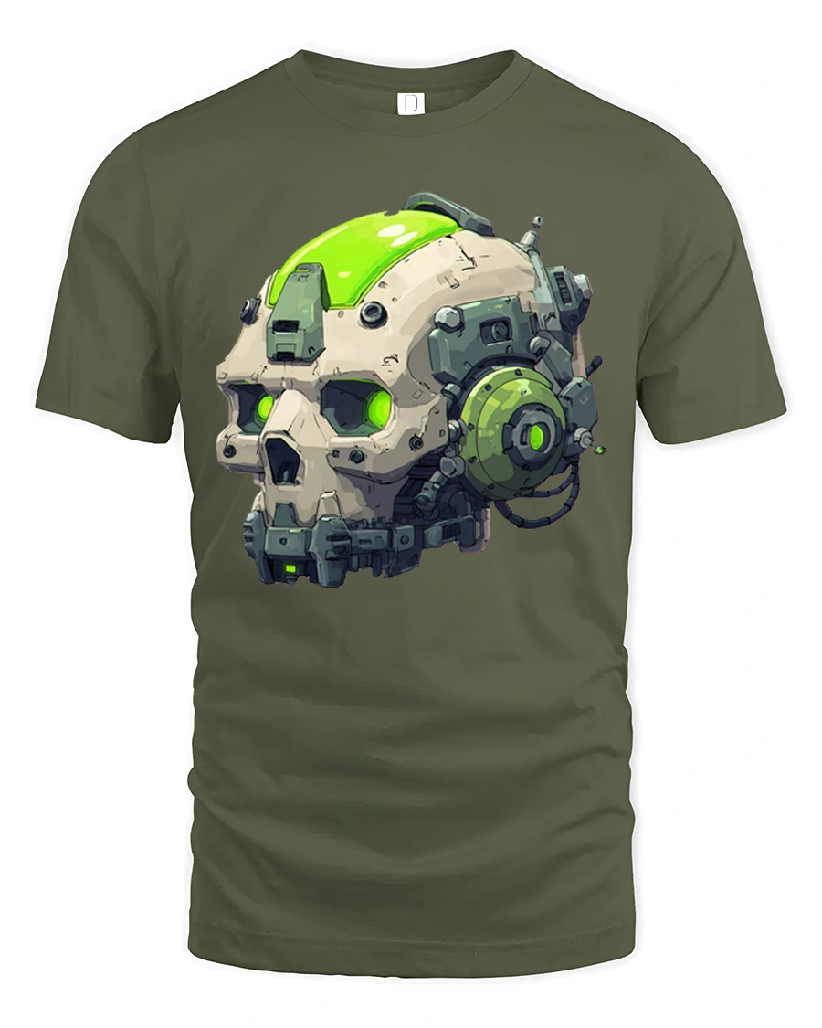 Futuristic Cyberpunk Skull T Shirt With Neon Tech Helmet - military green t-shirt on white background