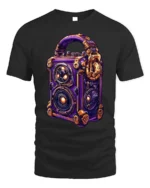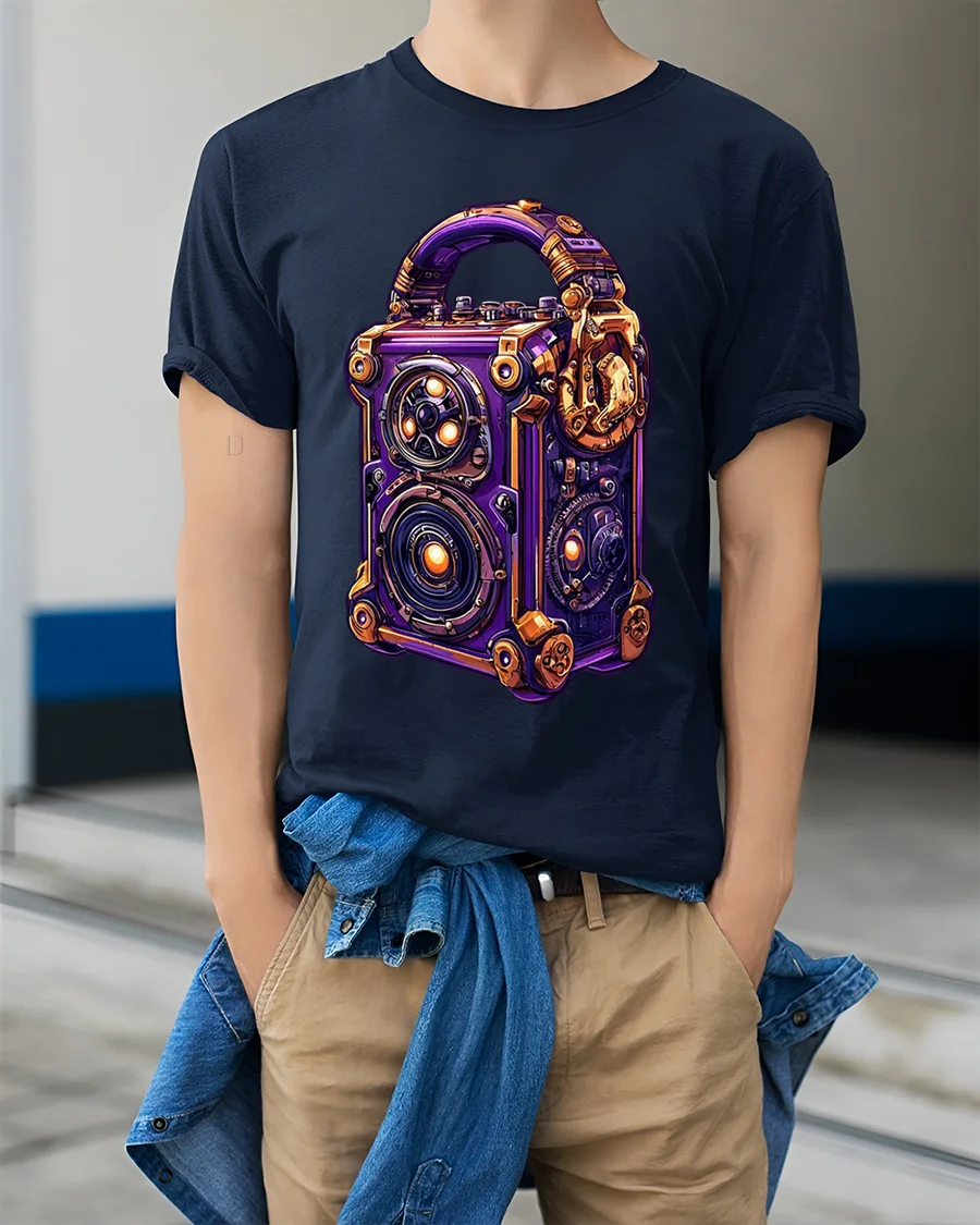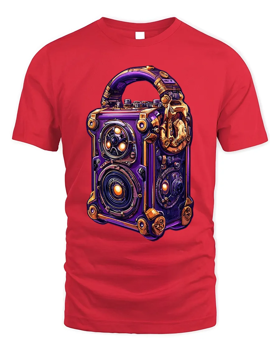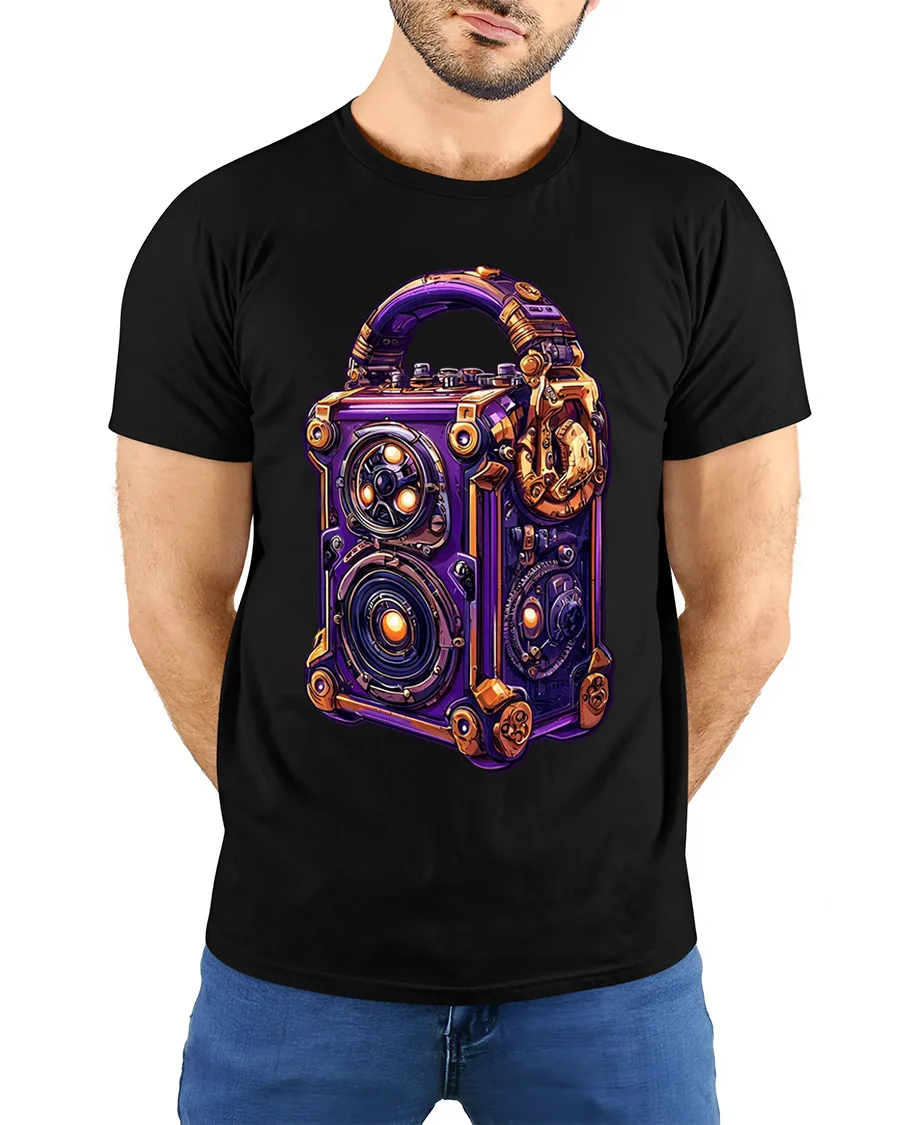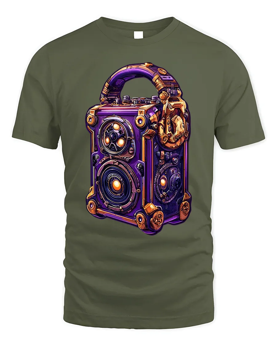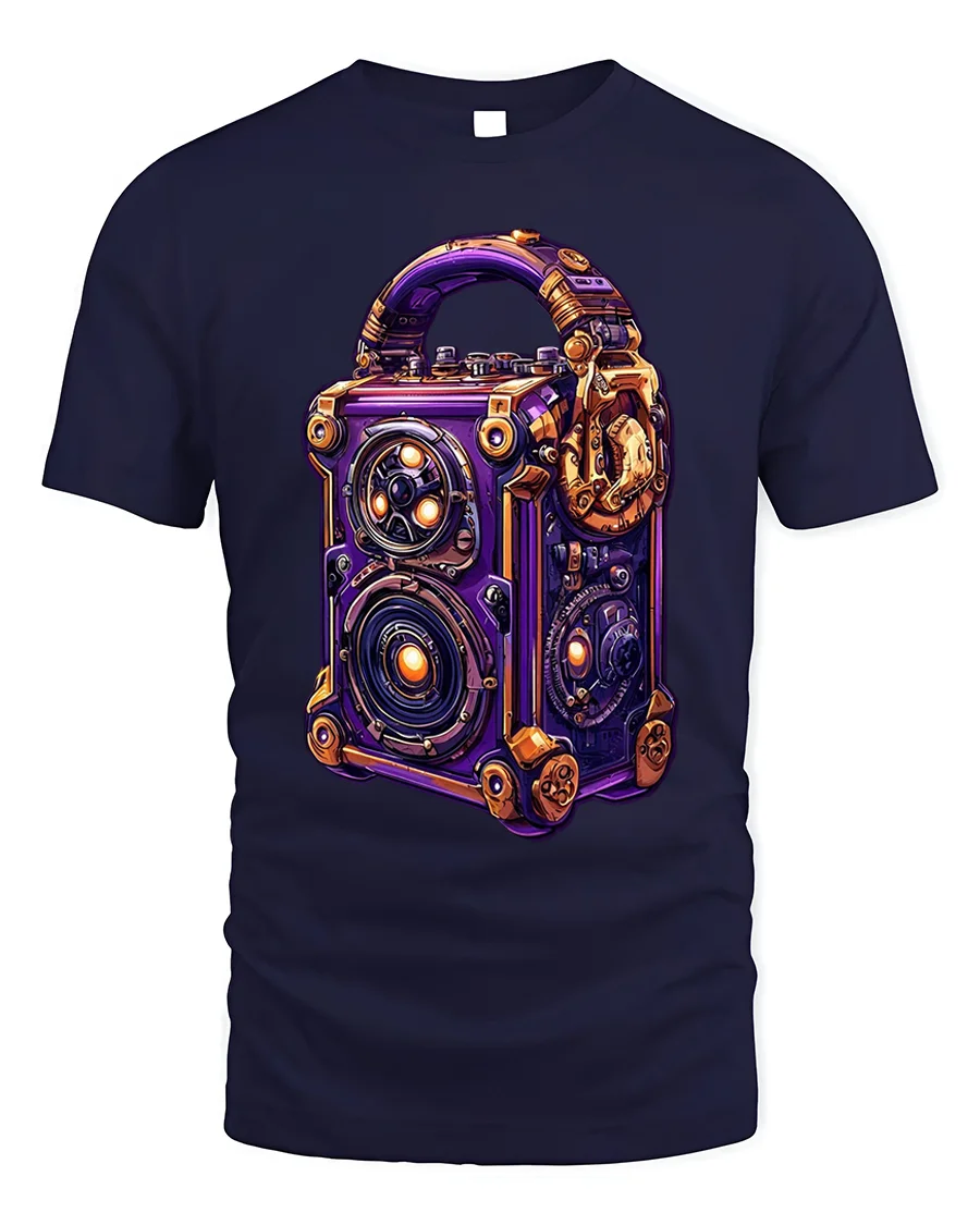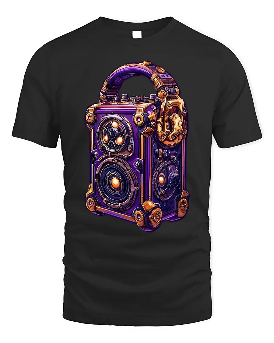 The striking artwork showcases a detailed neon boombox in shades of purple, gold, and orange, blending futuristic energy with classic street culture. Its glowing mechanical design feels alive—perfect for music fans, DJs, or anyone who loves tech-inspired fashion with a creative edge.