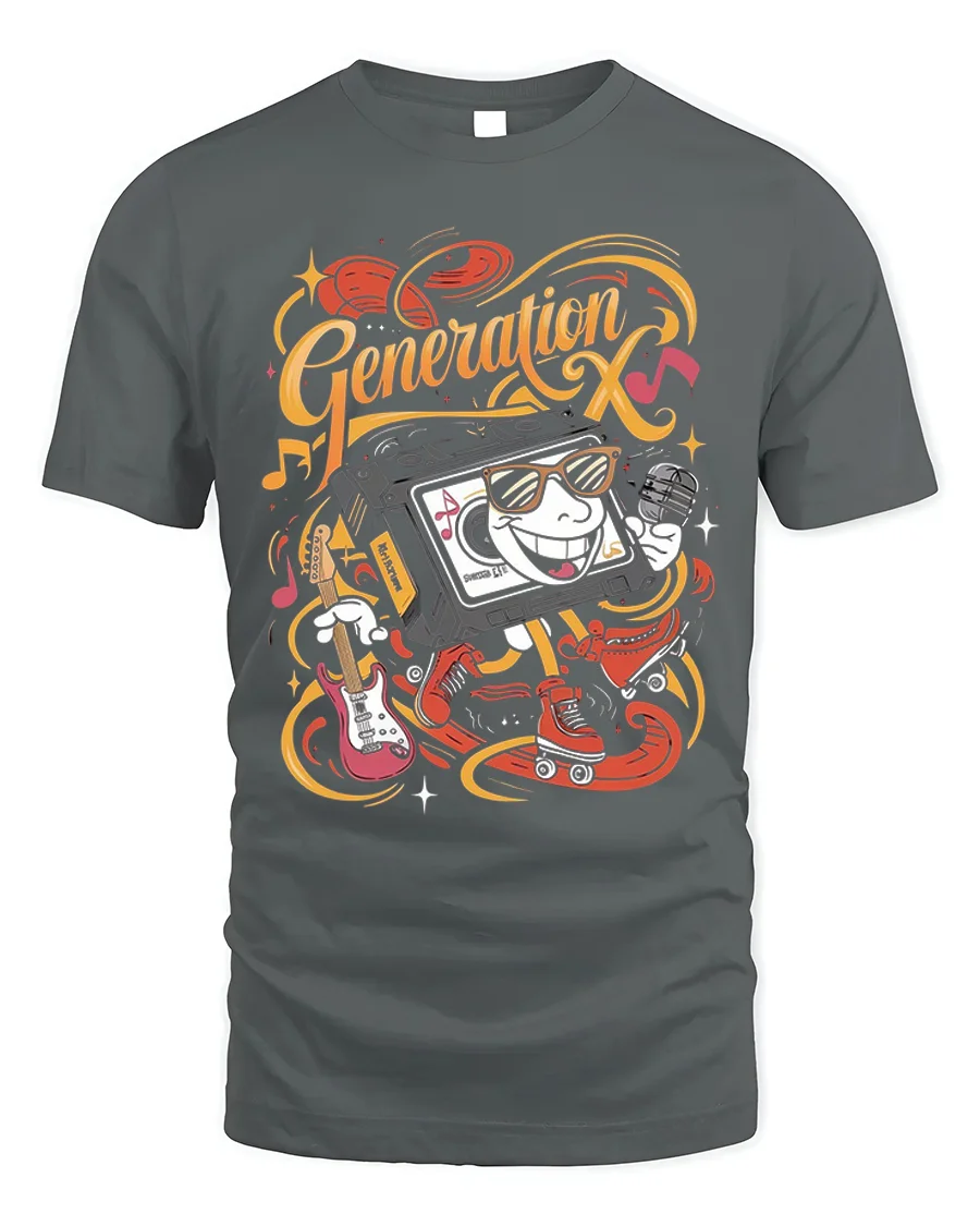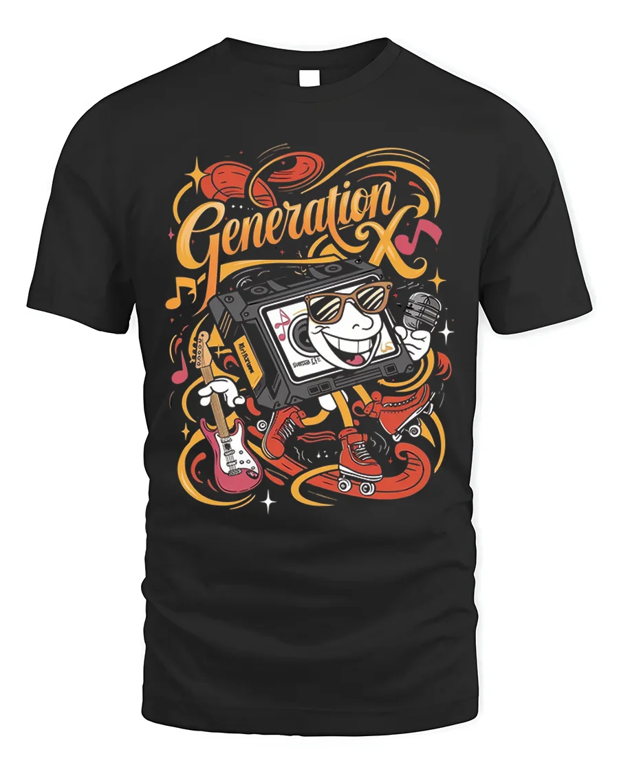 Generation X Retro Cassette Cool Music Art Graphic T-Shirt brings a fun and nostalgic throwback to the golden era of mixtapes, rock vibes, and 80s–90s pop culture. Featuring a lively cartoon cassette with sunglasses, a mic, guitar, sneakers, and roller skates, this playful artwork captures the carefree spirit of classic music culture. Perfect for anyone who grew up in or loves the Generation X era, this tee adds a cool retro vibe to any outfit.