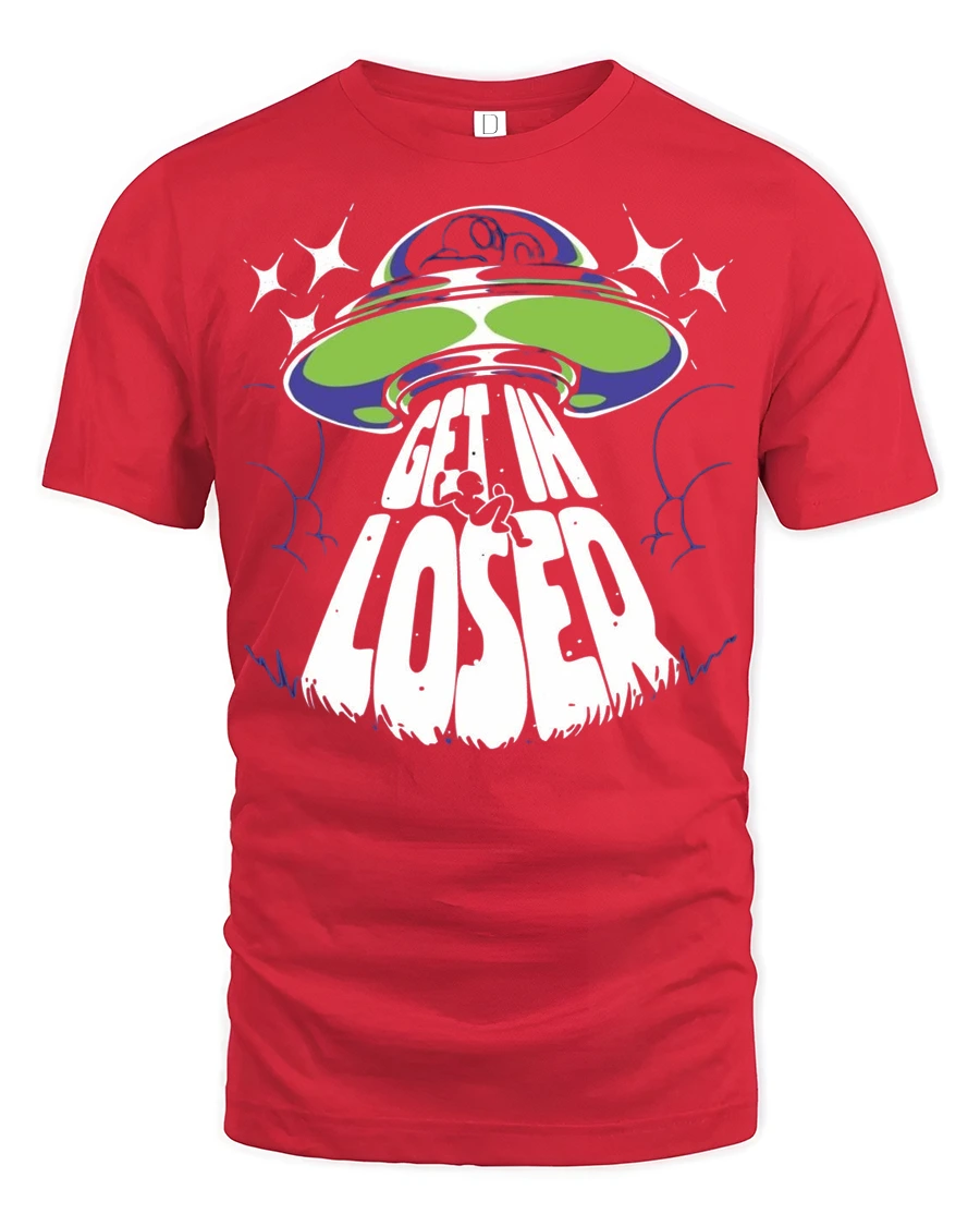 Get In Loser Alien UFO Graphic T Shirt Funny Space Tee - red t-shirt on white background