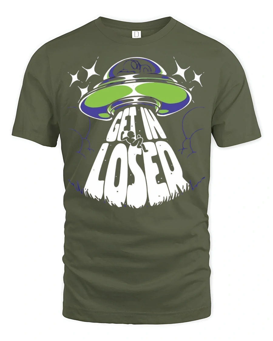 Get In Loser Alien UFO Graphic T Shirt Funny Space Tee - military green t-shirt on white background
