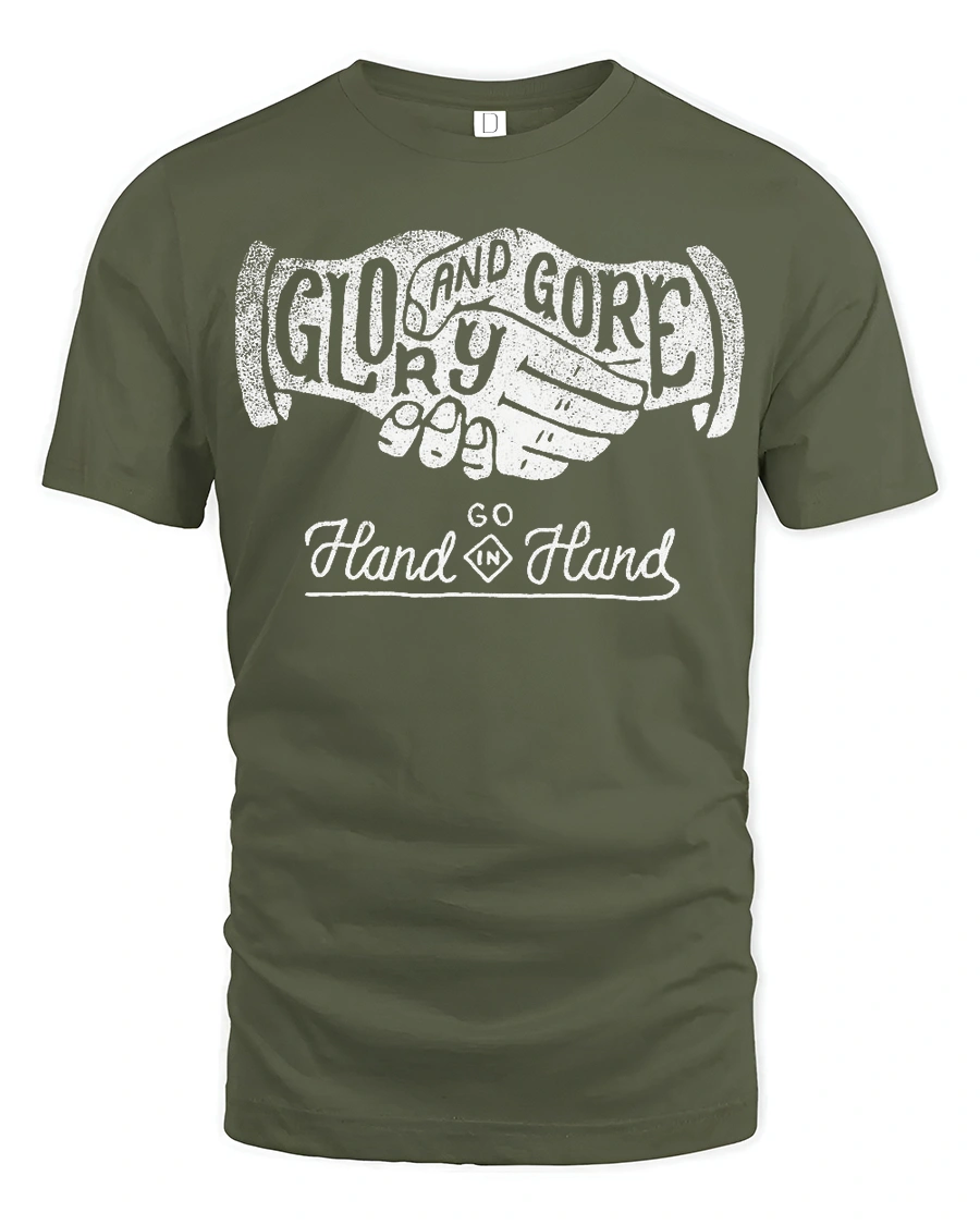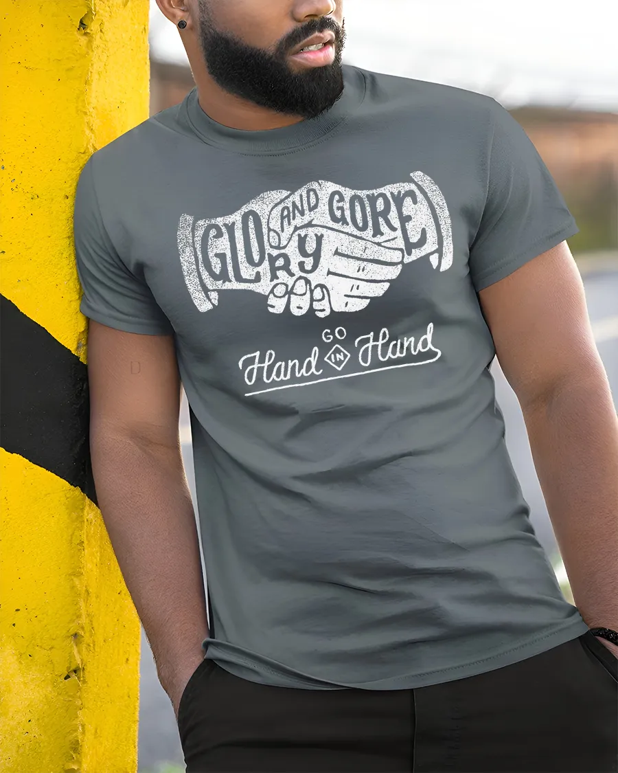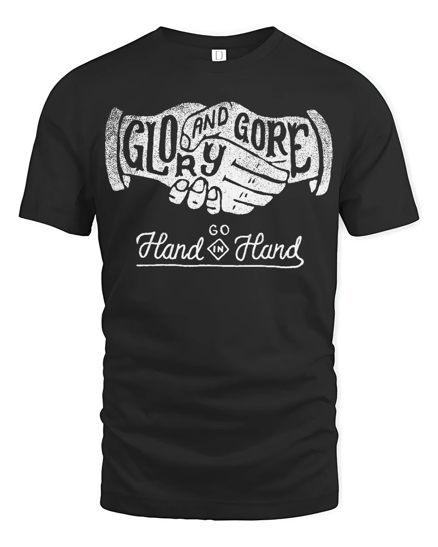 Glory And Gore Go Hand In Hand Vintage Handshake Graphic Tee Tshirt delivers a bold and thought provoking statement through classic design.