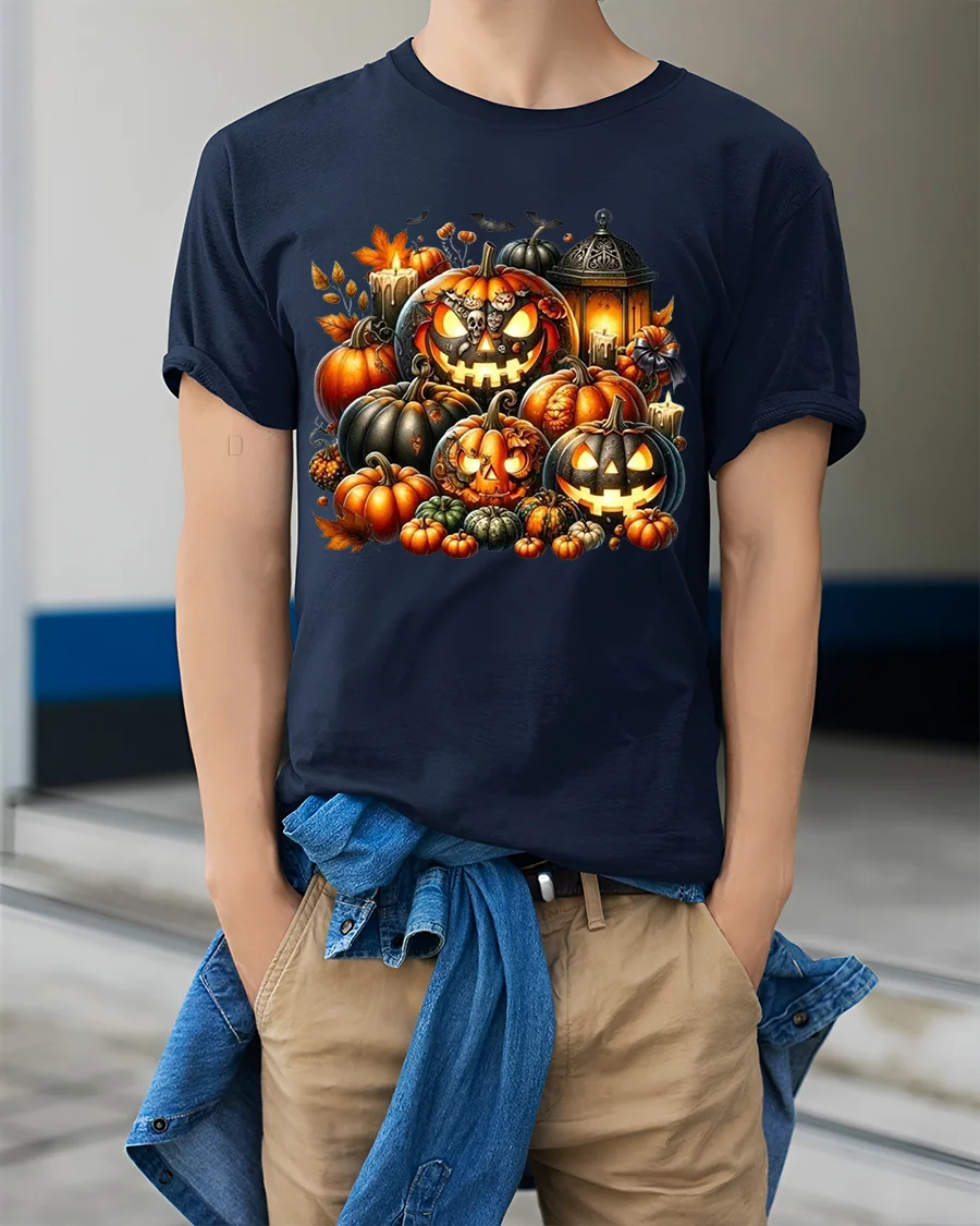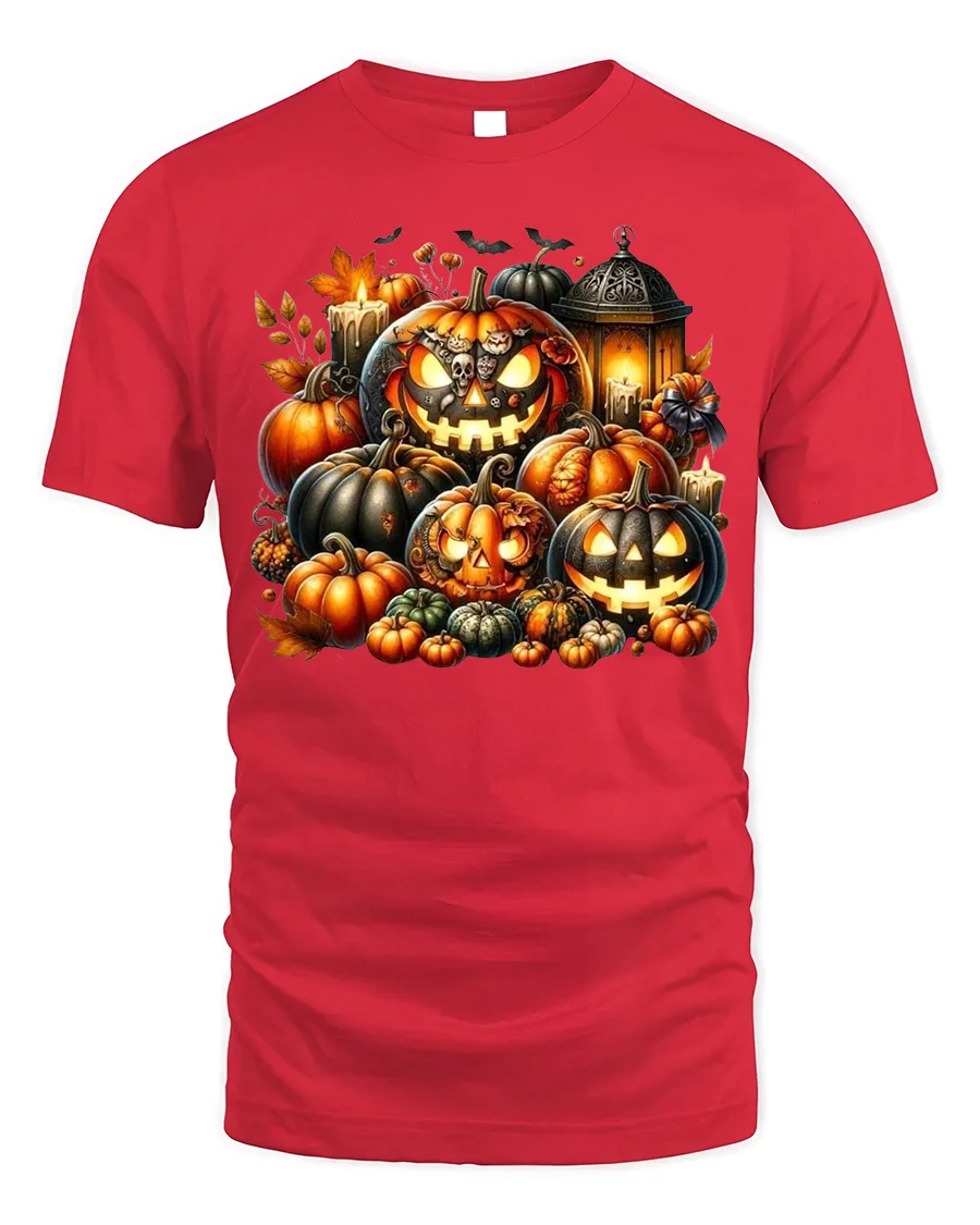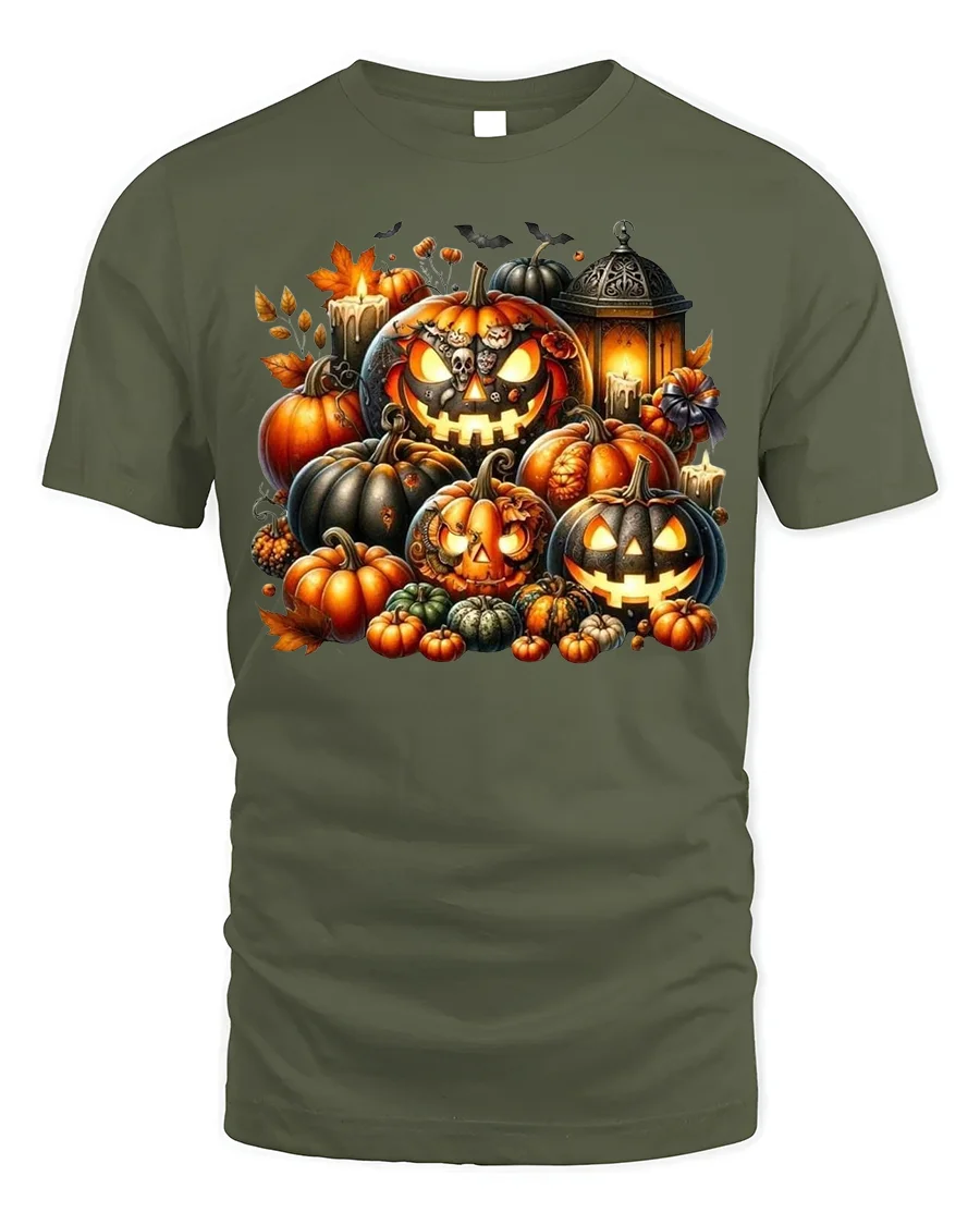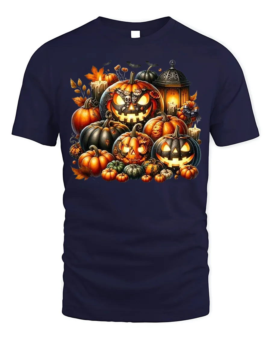 Light up your spooky style with the Glowing Pumpkin Jack O Lantern Halloween T-Shirt, a bold and festive design perfect for Halloween lovers. This detailed print features a collection of eerie jack-o’-lanterns glowing in the night, surrounded by autumn leaves, flickering candles, and gothic lanterns. The mix of bright orange pumpkins and haunting details captures the perfect Halloween vibe, making this tee a must-have for anyone who loves celebrating the spooky season.