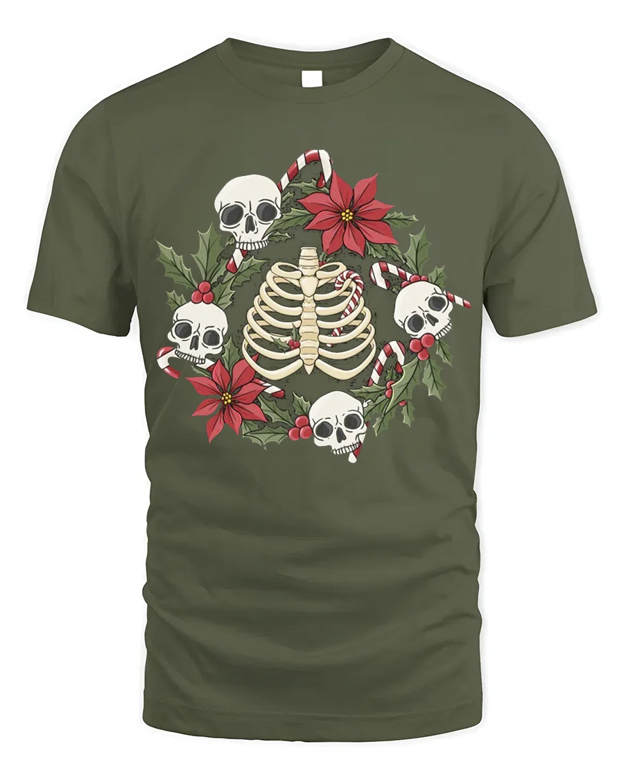 Embrace the darker side of the festive season with our striking Gothic Christmas Skull Wreath T-shirt! This unique tee features an intricate design of a Christmas wreath made from holly, poinsettias, candy canes, and chilling skulls, with a rib cage at its center. It’s the perfect blend of gothic aesthetics and holiday cheer, offering an alternative and bold statement for those who prefer their Christmas with an edgy twist. Made from soft, comfortable material, this t-shirt is designed for both style and lasting wear.