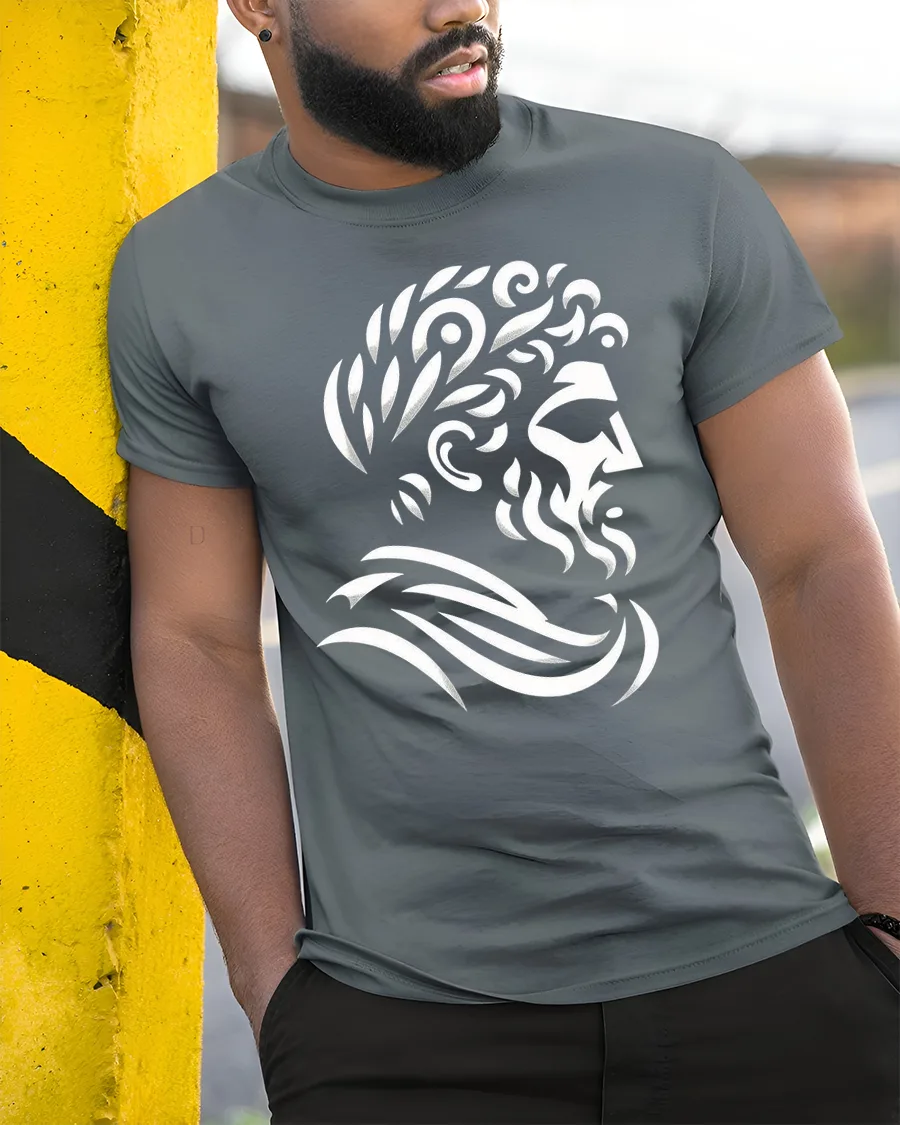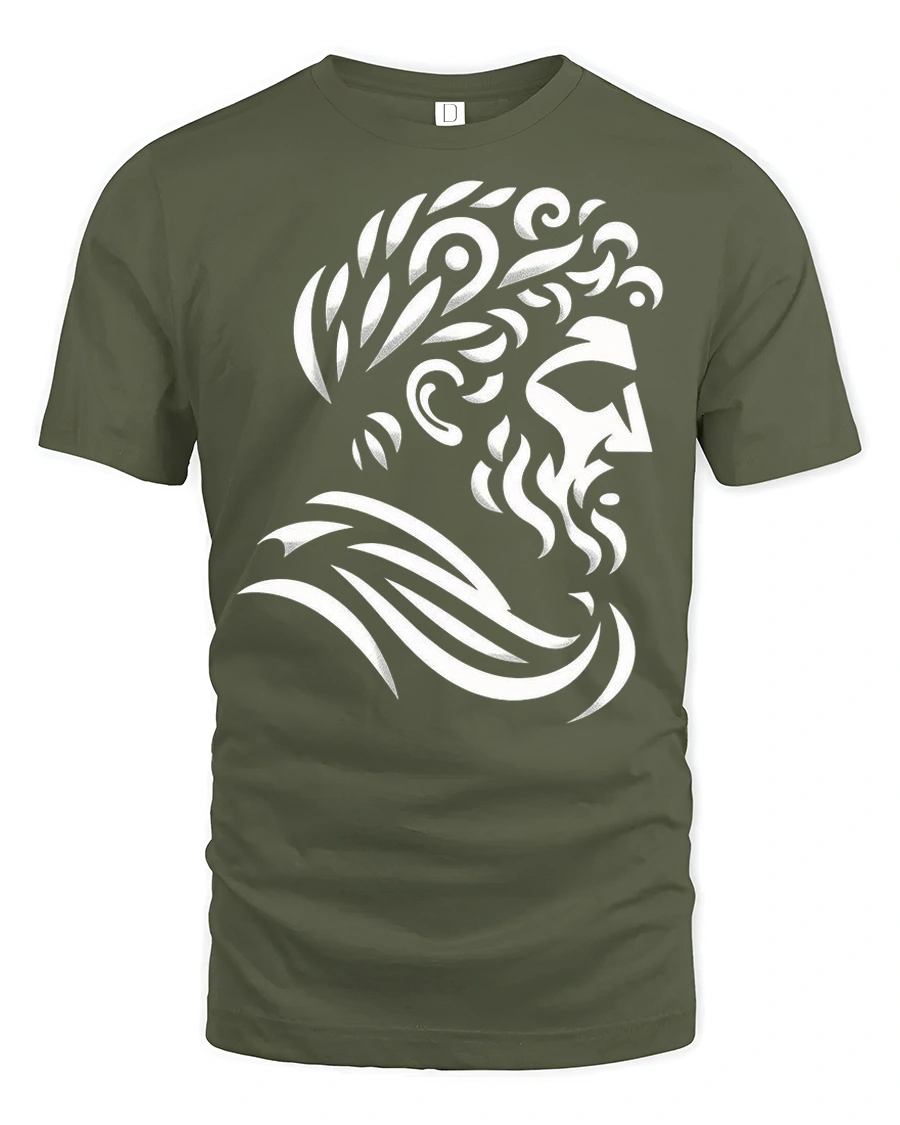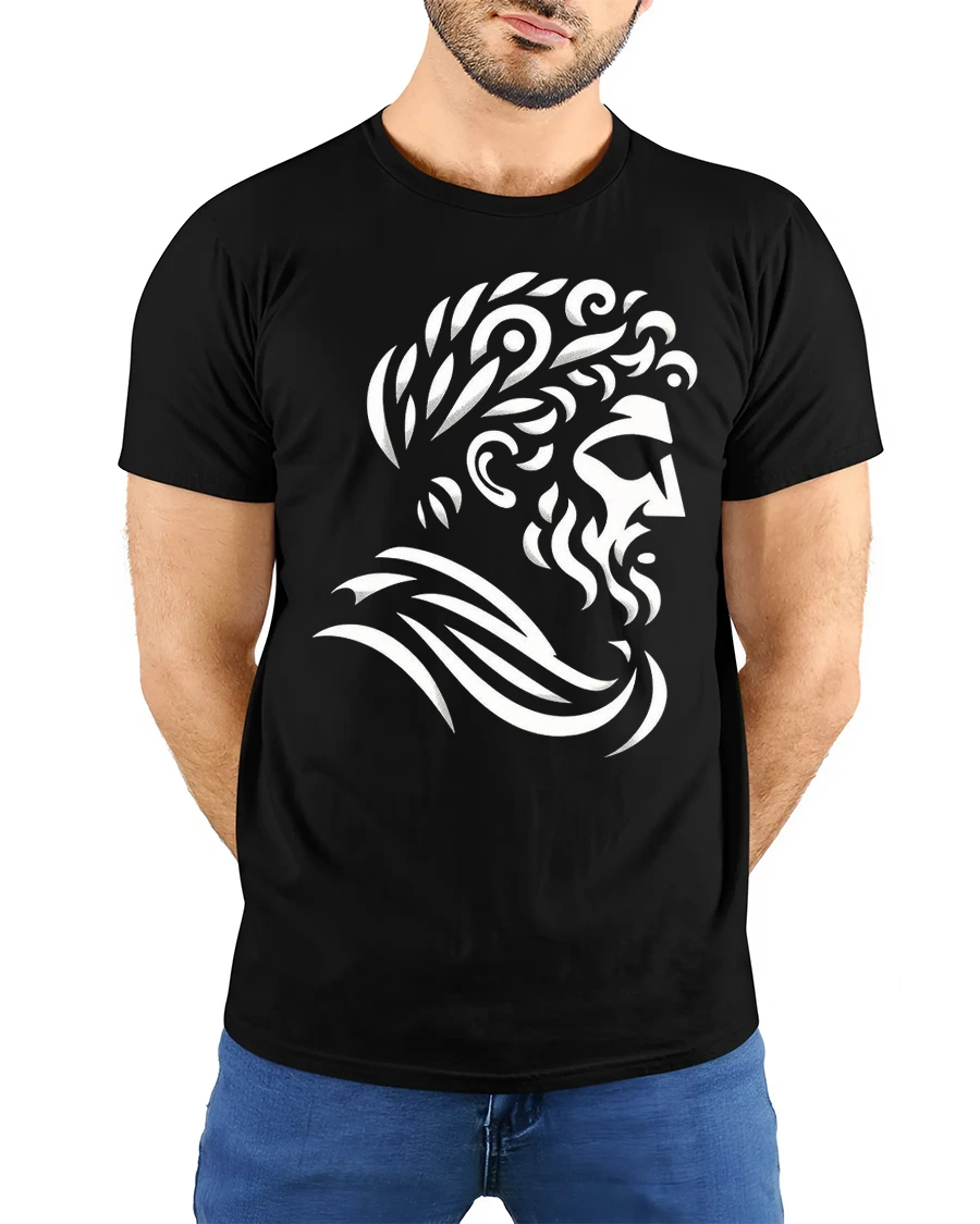 Featuring a stylized portrait inspired by ancient Greek sculptures, this graphic reflects wisdom, strength, and artistic heritage.
