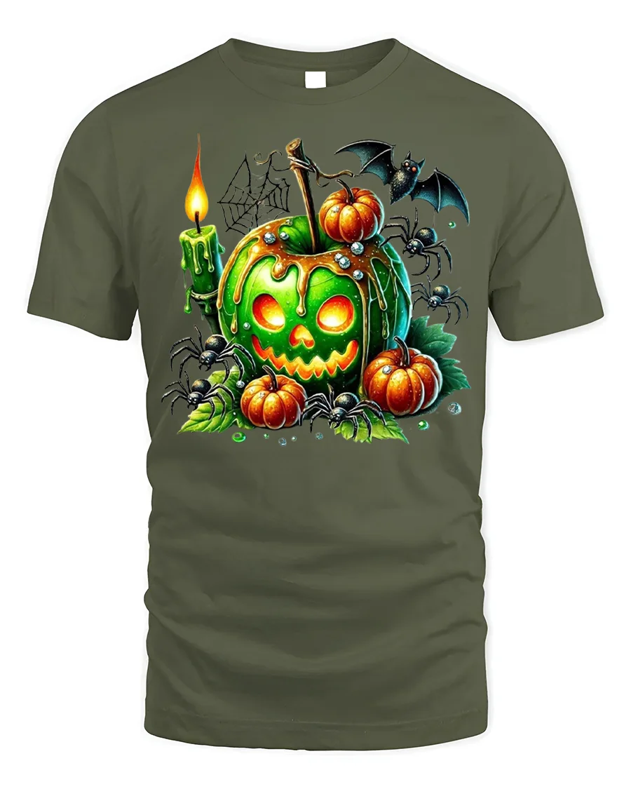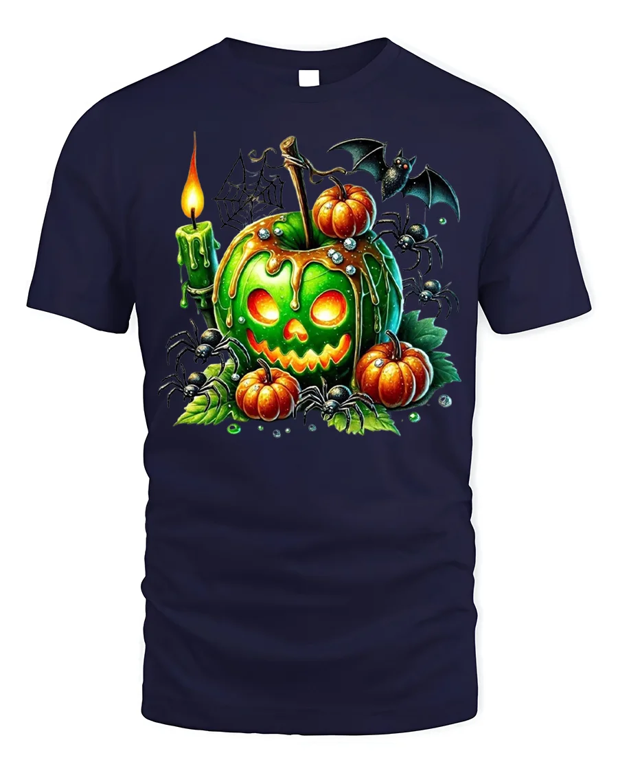 This Green Pumpkin Candle Halloween Horror Tshirt Style is the perfect blend of creepy and colorful design for the Halloween season. Featuring a glowing green pumpkin with a sinister face, surrounded by candles, bats, and crawling spiders, this tshirt captures the dark and playful spirit of Halloween. It’s an eye-catching design that instantly sets the mood for haunted nights, costume parties, or just everyday October wear.