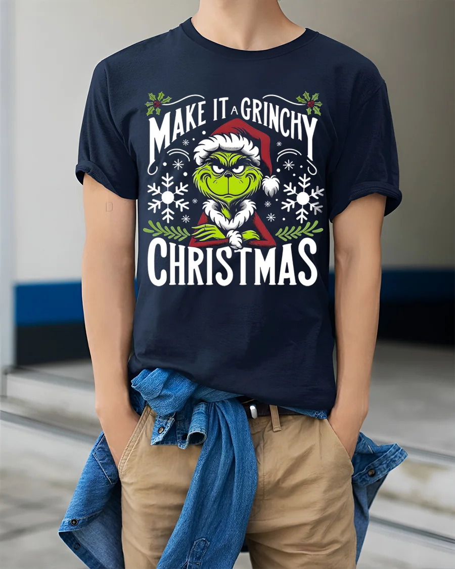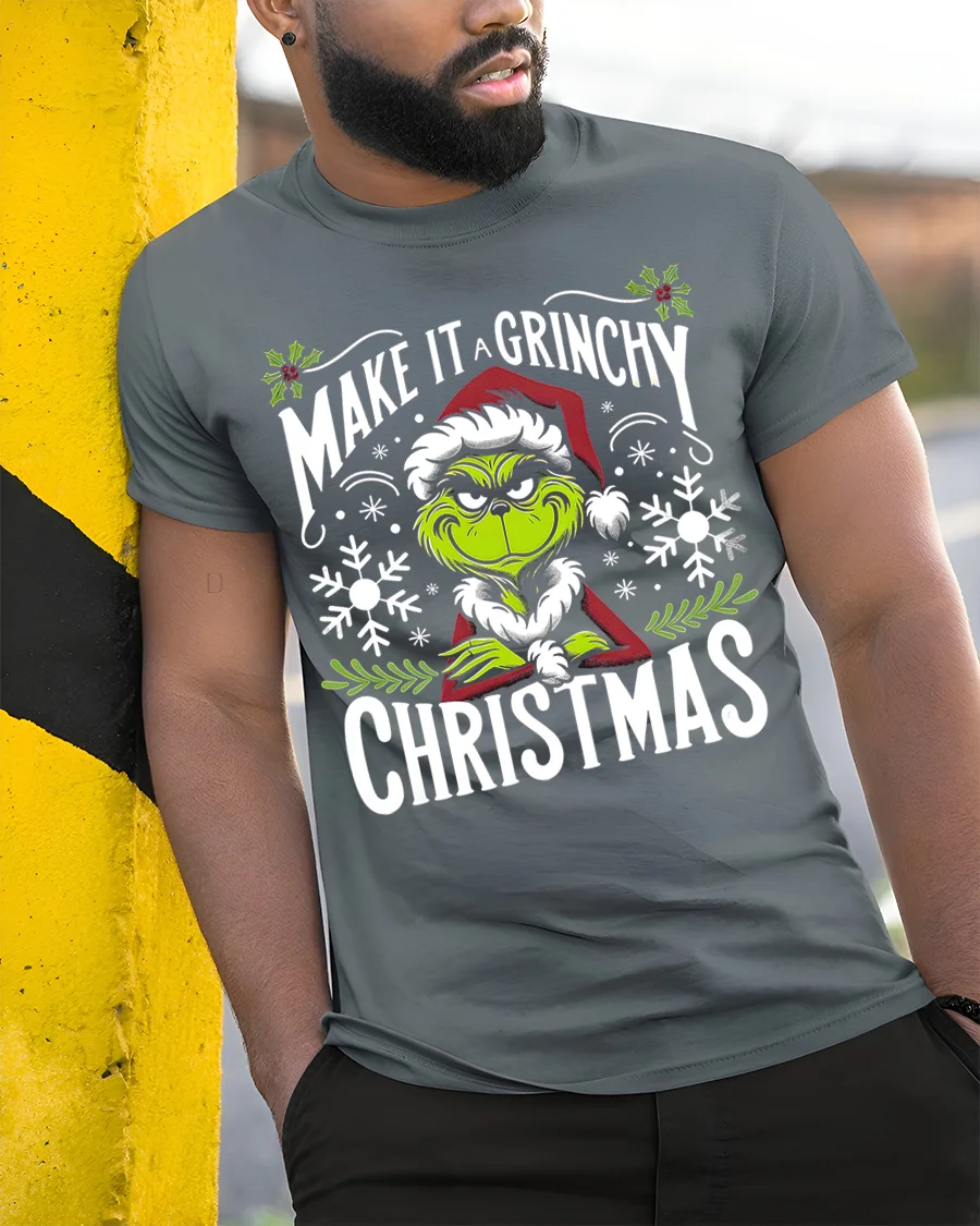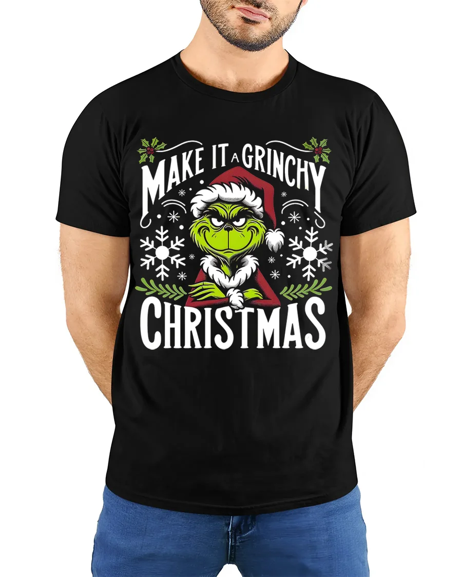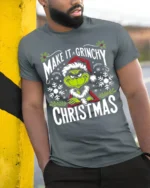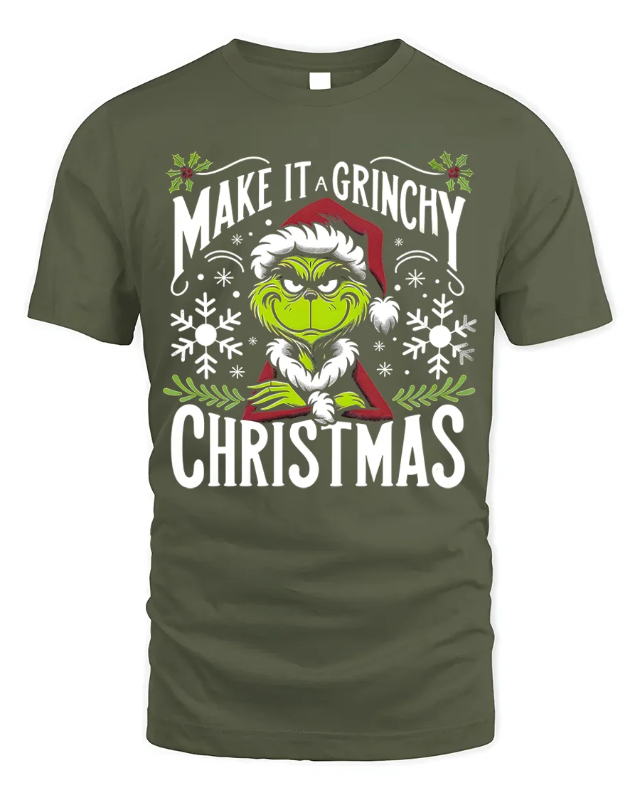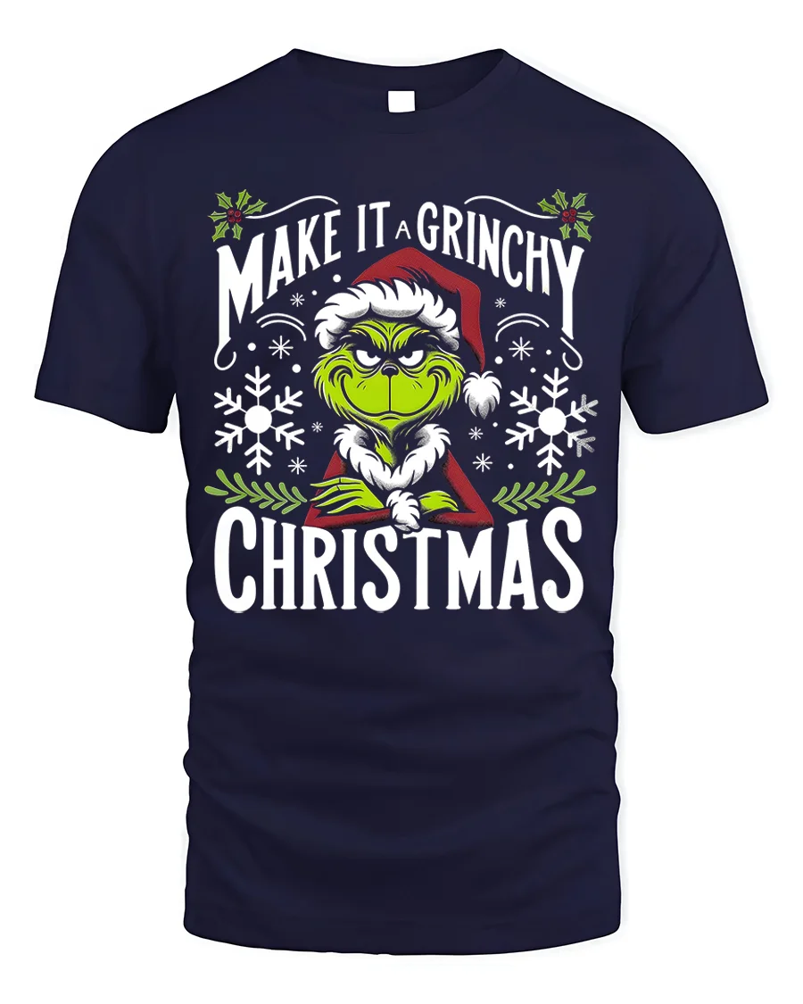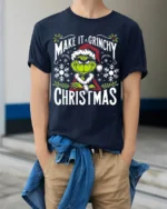 Embrace your inner grump with a wink and a smile this season with our hilarious Grinchy Christmas T-shirt! This witty tee features everyone’s favorite green character, the Grinch, looking mischievously festive, surrounded by snowflakes and the playful phrase “MAKE IT A GRINCHY CHRISTMAS.” It’s the perfect shirt for those who love to celebrate the holidays with a touch of playful cynicism and iconic humor. Made from soft, comfortable material, this t-shirt ensures you stay cozy while showcasing your unique holiday spirit.
