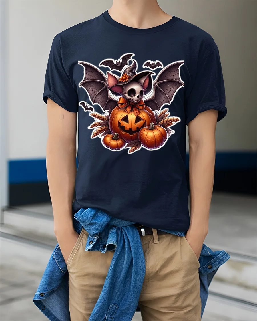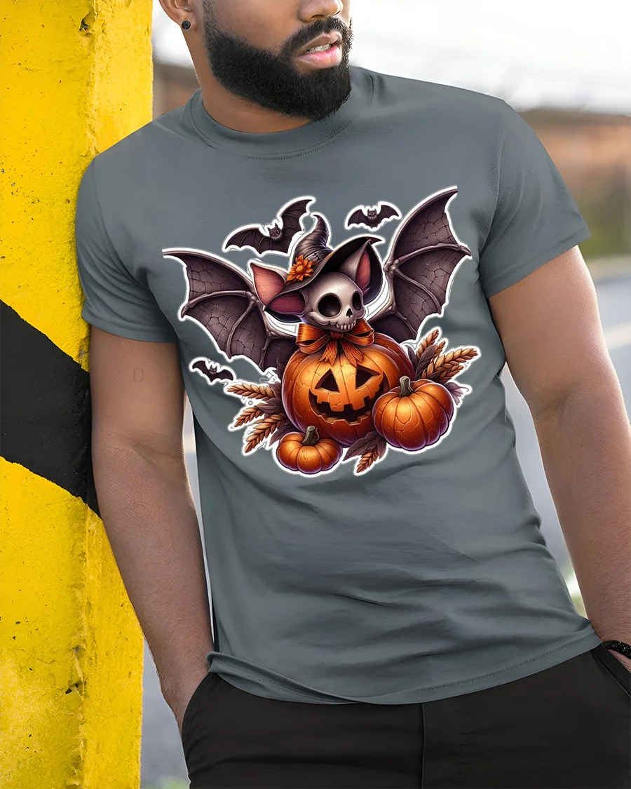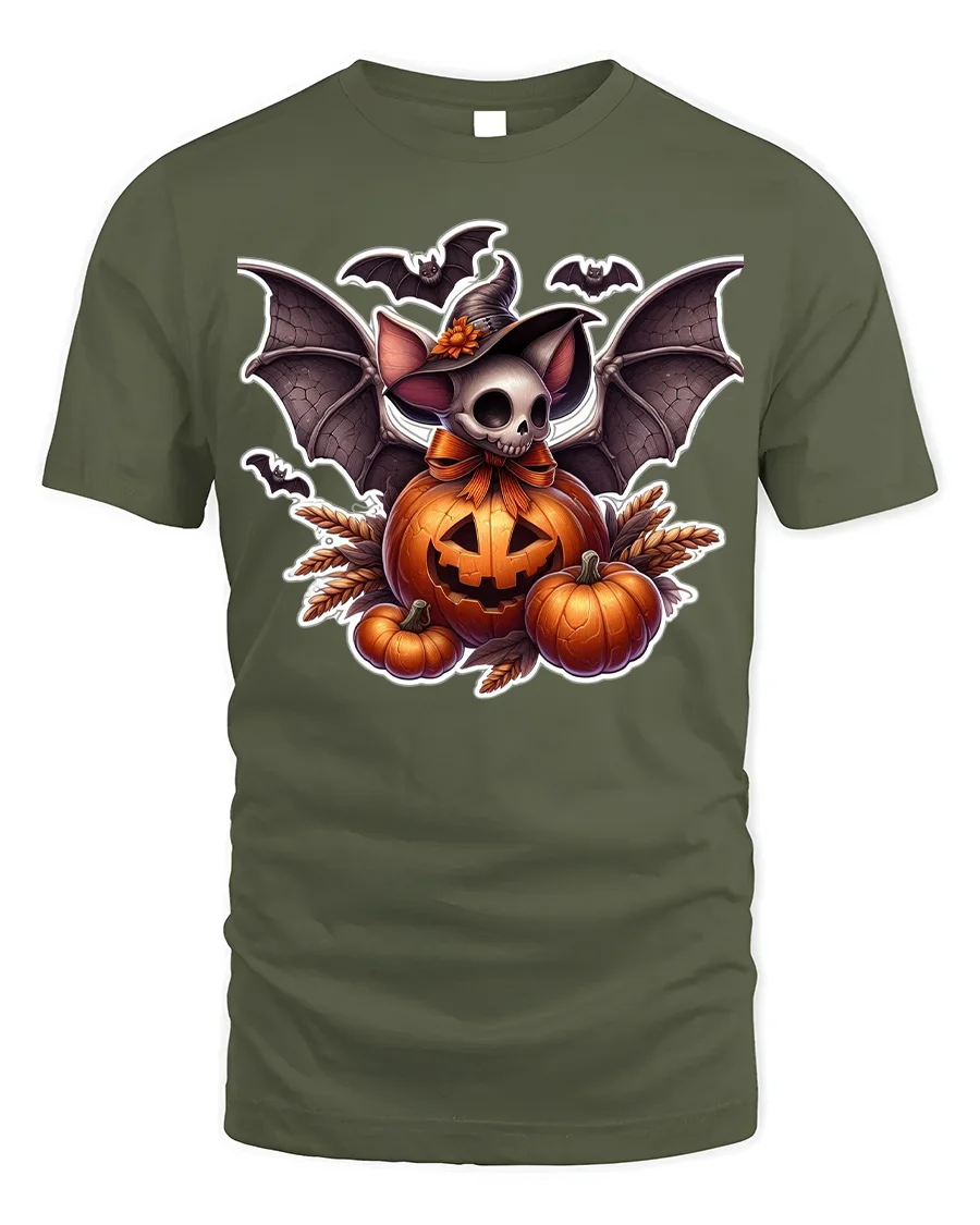 Step into the spooky spirit of fall with this Halloween Bat Skull Pumpkin Graphic T-Shirt, designed to capture the darker and more mysterious side of the season. The bold artwork features a winged bat with a skull face perched above glowing pumpkins, accented with a witch’s hat and eerie flying bats. This haunting yet stylish design is perfect for those who love Halloween’s gothic vibe while still embracing its festive charm.