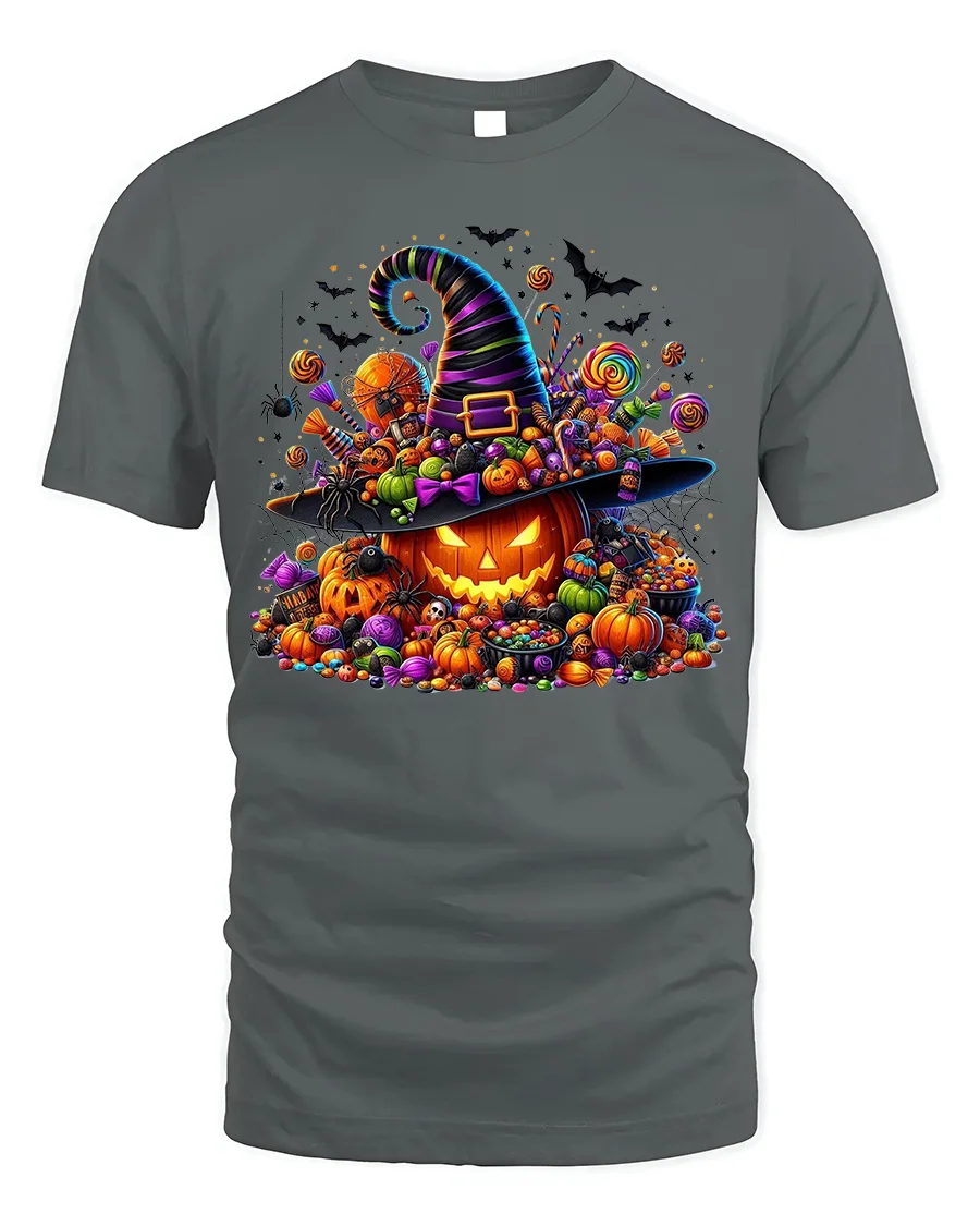 Crafted with high-quality material, the Halloween Candy Pumpkin Witch Hat T-Shirt offers both comfort and durability, making it ideal for parties, haunted houses, or casual fall wear. The bold print stands out against the dark background, giving you a striking look that blends both spooky and festive vibes. Pair it with jeans or layer it under a jacket for the perfect Halloween outfit.