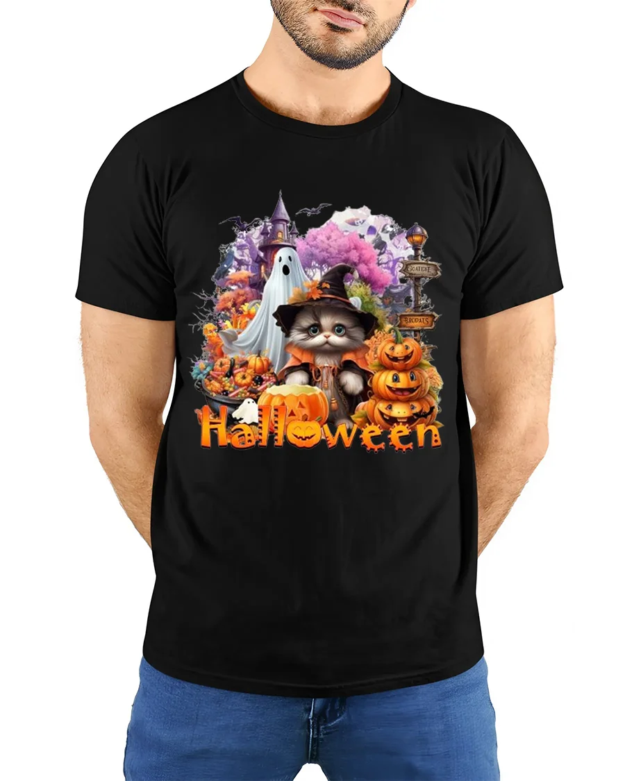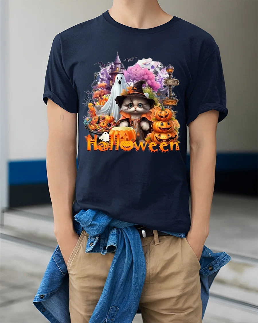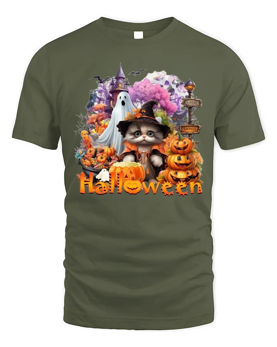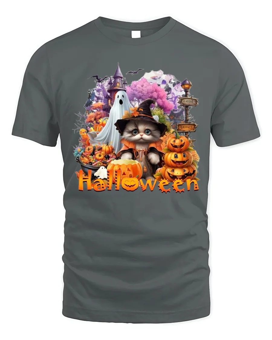 Halloween Cat Ghost Pumpkin Graphic T-Shirt is the perfect way to celebrate spooky season with a mix of cute and creepy style.