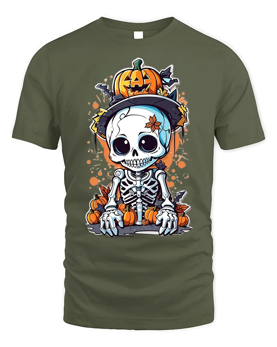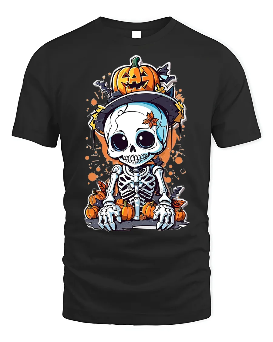 Add a playful twist to spooky season with the Halloween Cute Skeleton Pumpkin T-Shirt Spooky Fun. This eye-catching tee features an adorable cartoon skeleton with big expressive eyes, surrounded by bright pumpkins, autumn leaves, and a jack-o’-lantern perched on its head. Blending creepy and cute, it’s a perfect design for those who love celebrating Halloween with a touch of fun and charm.