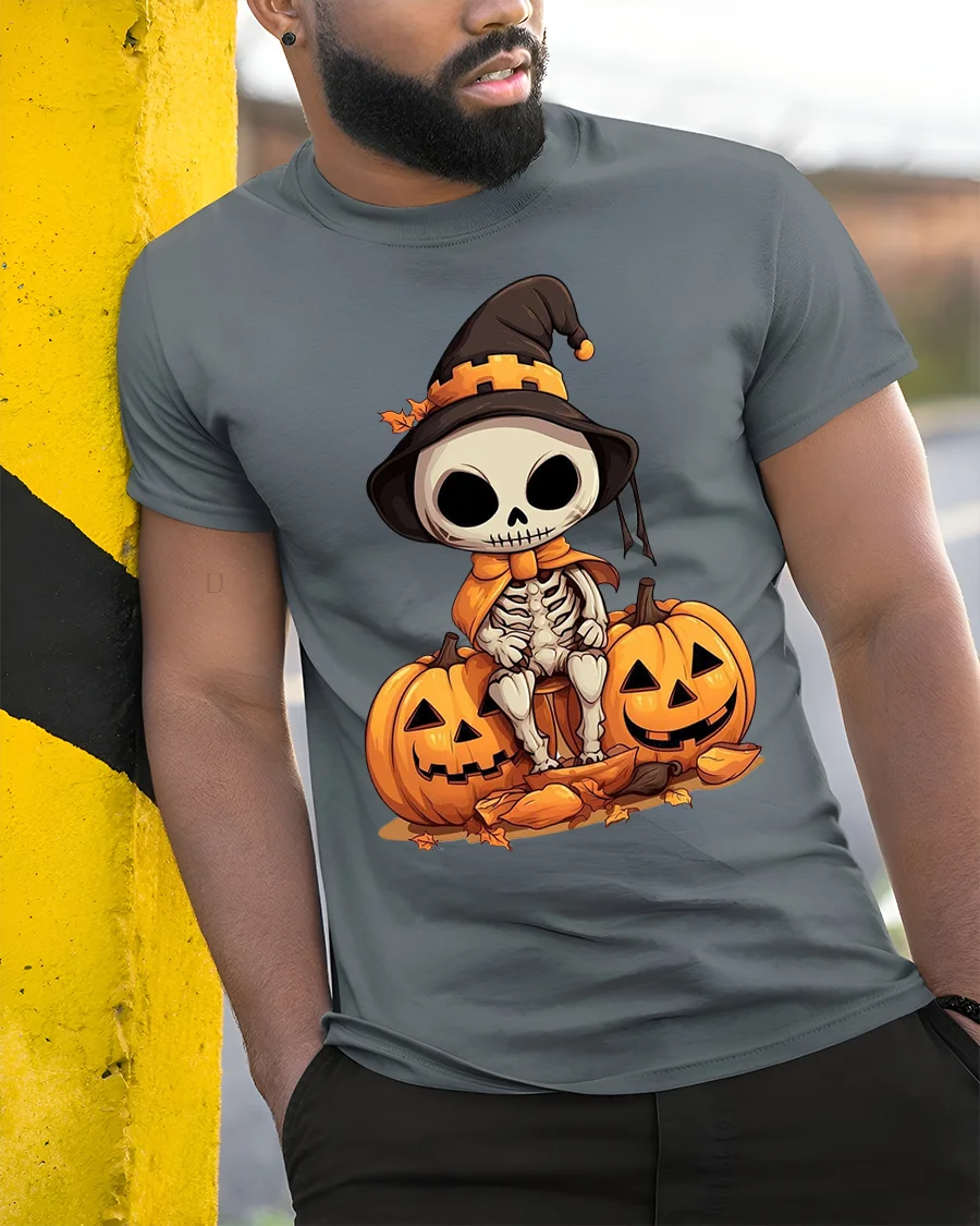 Made from soft, breathable fabric, this Halloween t-shirt provides comfort and durability, making it ideal for wearing all season long. The bright pumpkins and cartoon skeleton design pop against the black background, creating a standout look that captures attention. Whether you’re going trick-or-treating, attending a Halloween party, or just adding some festive spirit to your outfit, this tee delivers the perfect balance of cute and spooky.