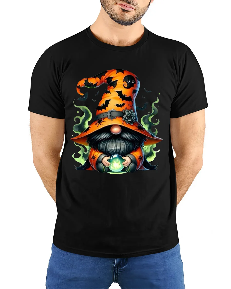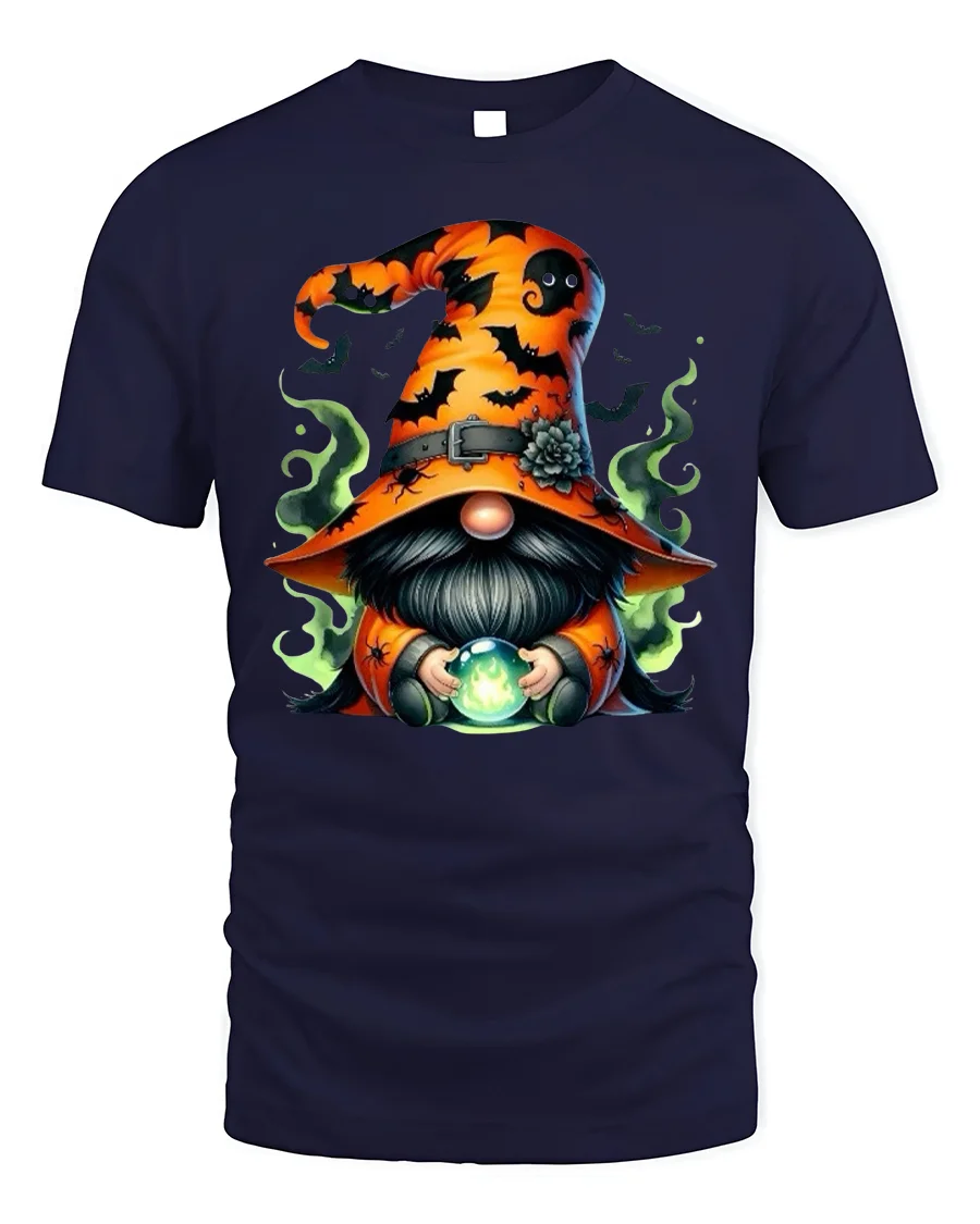 Add a touch of magical mischief to your Halloween wardrobe with this Halloween Gnome Wizard Crystal Ball T-Shirt, designed for fans of spooky charm and fantasy style. Featuring a bearded gnome dressed in an orange wizard hat decorated with bats, holding a glowing crystal ball surrounded by green mystical smoke, this design perfectly blends Halloween spirit with a magical twist. It’s an ideal shirt for anyone who loves unique and playful holiday graphics.