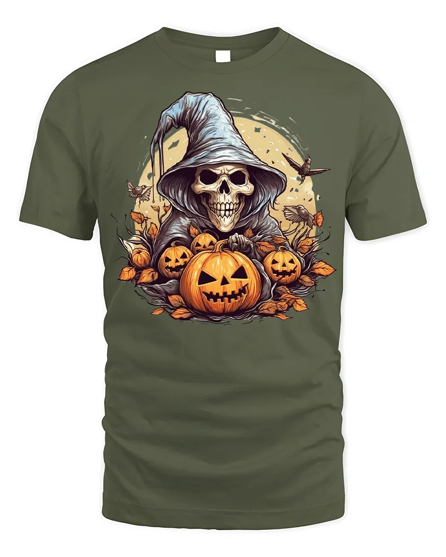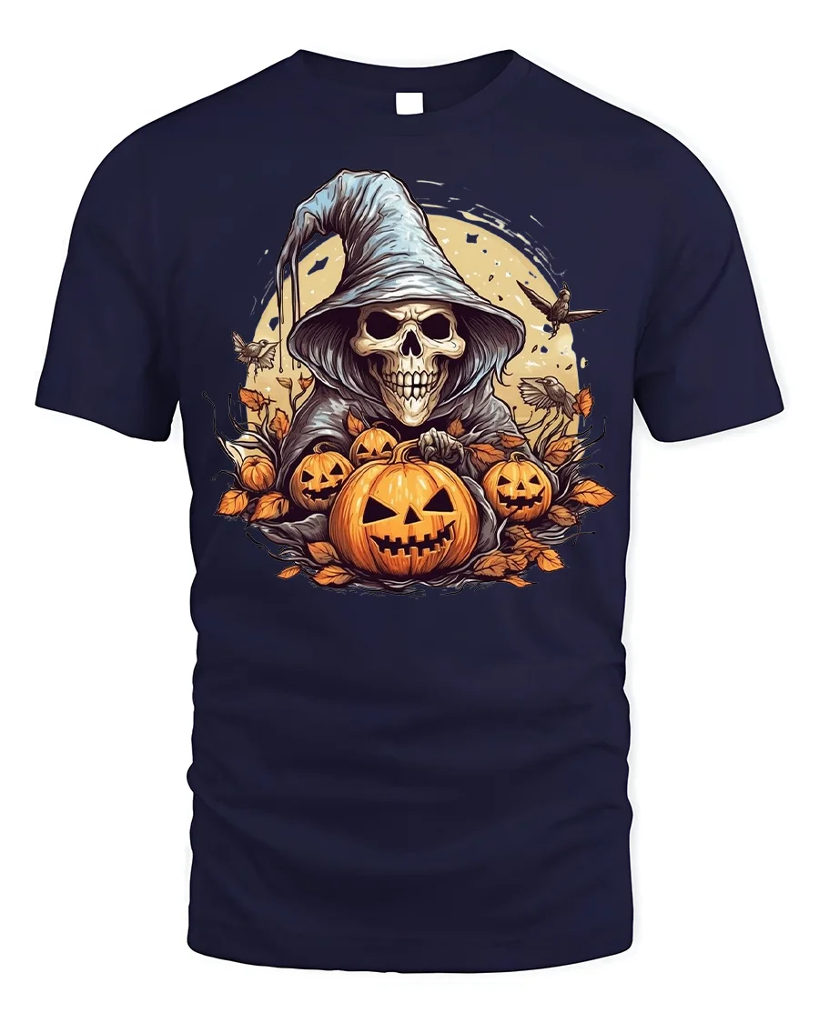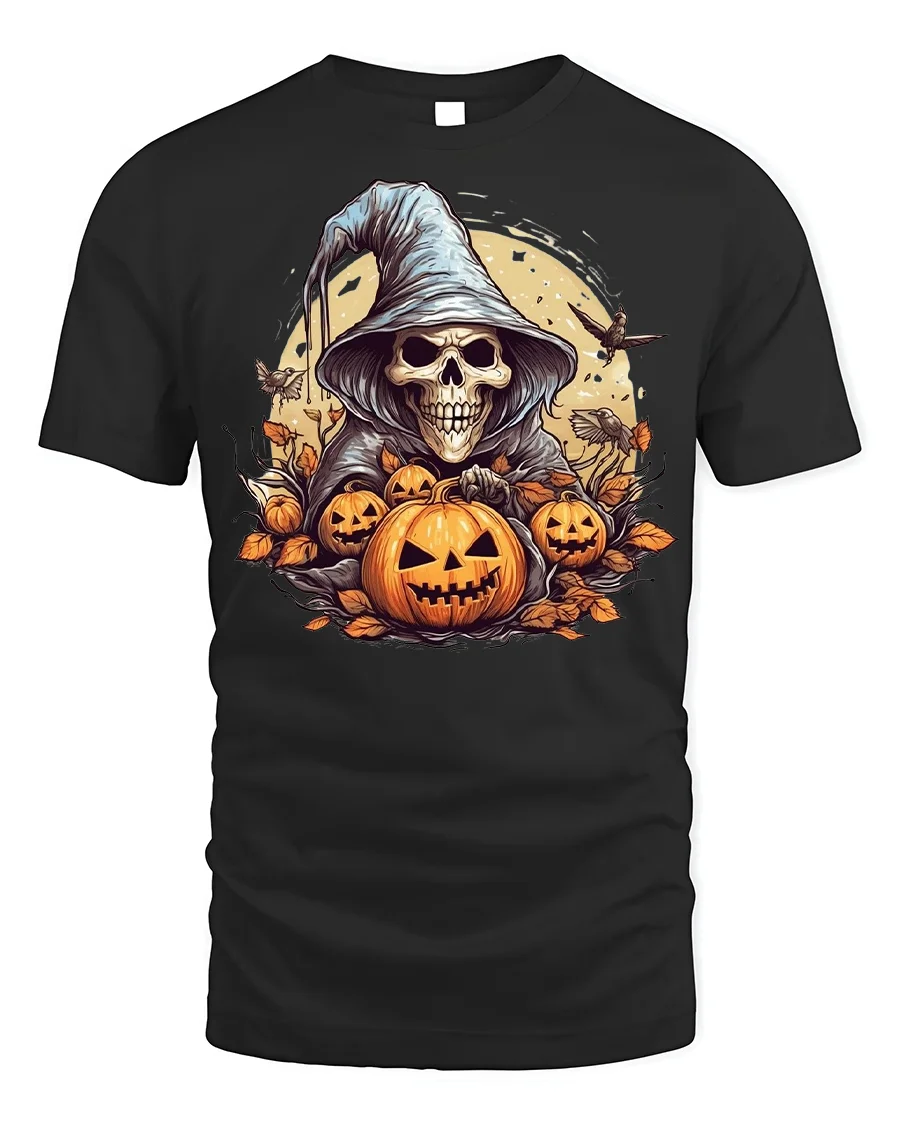 Embrace the dark side of Halloween with the Halloween Grim Reaper Pumpkin T-Shirt Spooky Night. This chilling design features a sinister grim reaper cloaked in a hood, surrounded by glowing jack-o’-lanterns, autumn leaves, and flying crows under a haunted moonlit sky. The bold artwork brings together all the classic elements of Halloween—skulls, pumpkins, and eerie night vibes—making it a standout piece for the spooky season.