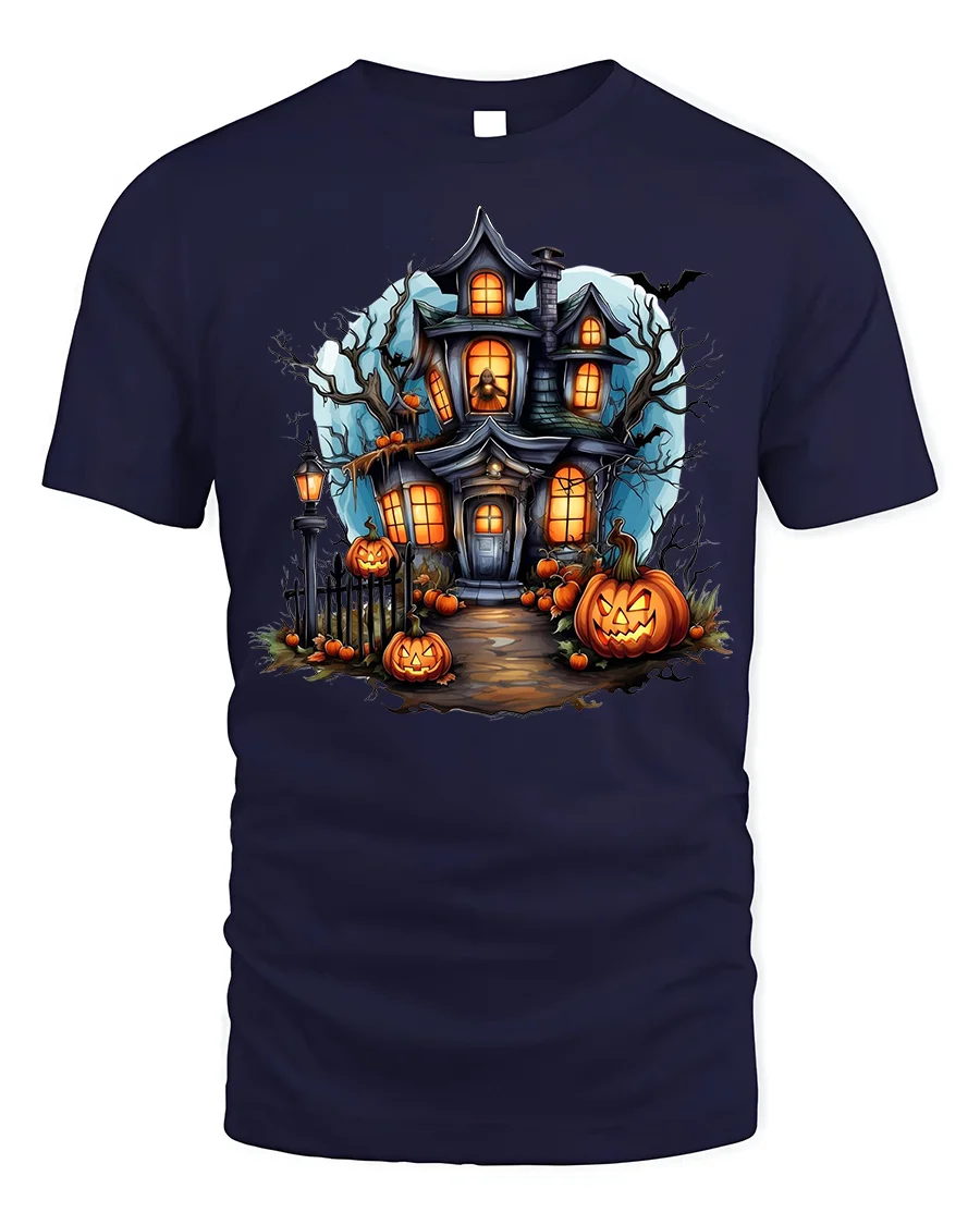 Crafted from soft, breathable fabric, this Halloween t-shirt blends comfort and standout style. Whether you’re trick-or-treating, attending a haunted house, joining a Halloween party, or just showing your love for spooky nights, this tee is the perfect addition to your October wardrobe. The glowing pumpkins and detailed haunted house artwork pop against the black background, making it a true seasonal statement piece.