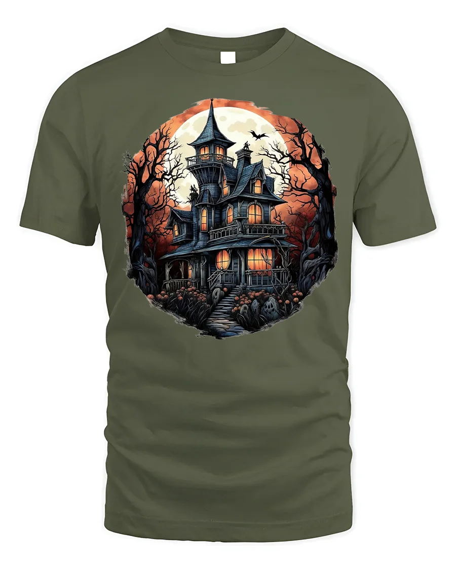 Halloween Haunted Mansion T-Shirt Spooky Moon Night - military green t-shirt on white background