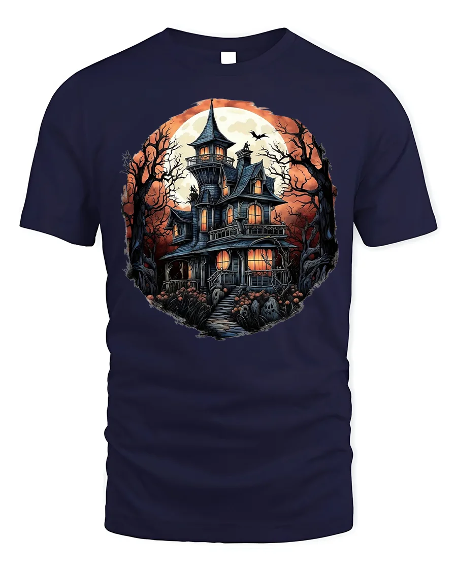 Halloween Haunted Mansion T-Shirt Spooky Moon Night - navy t-shirt on white background