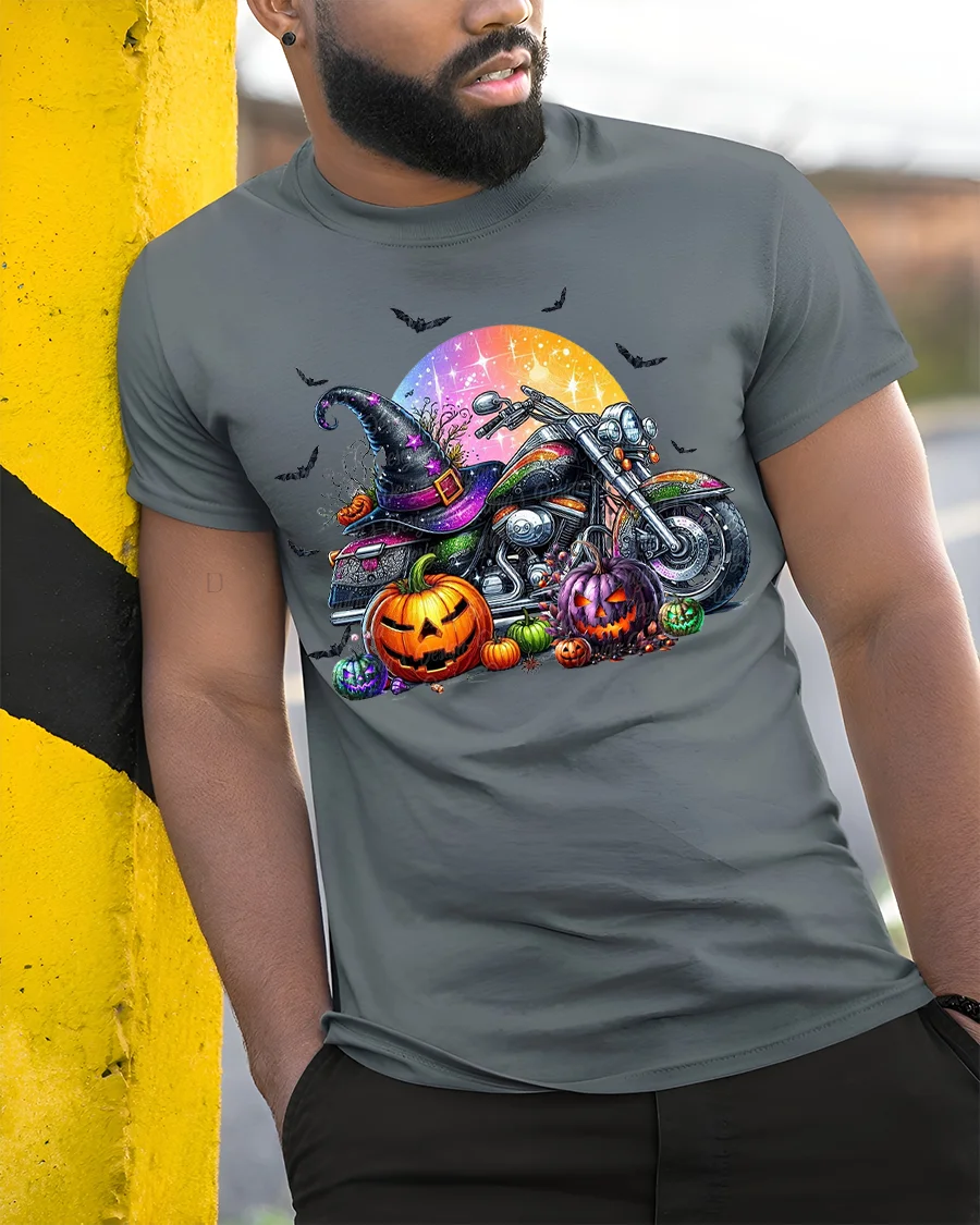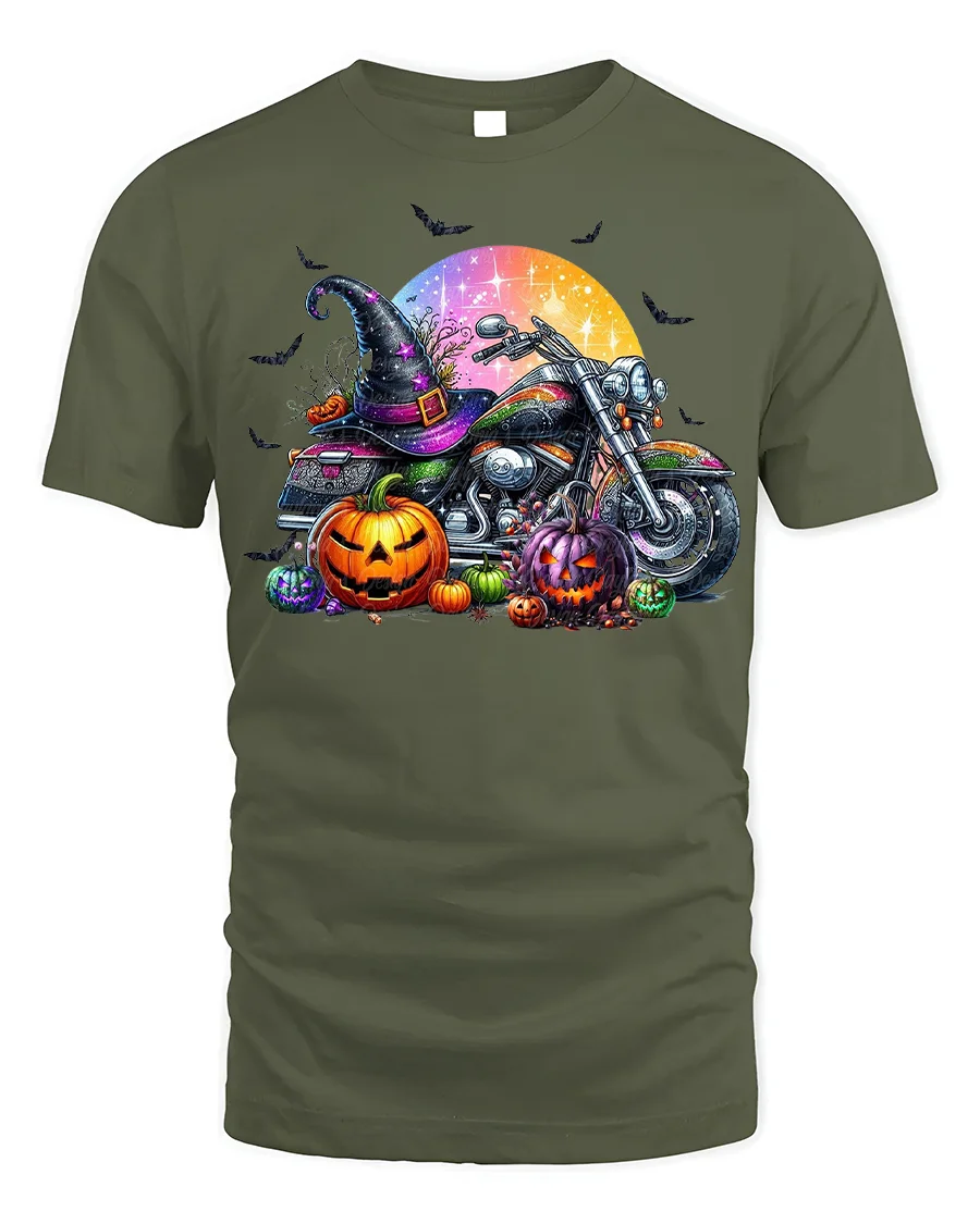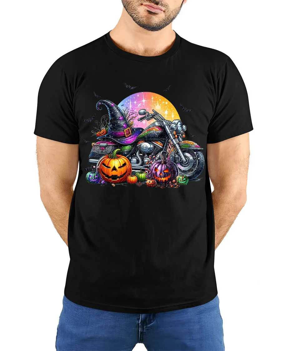 The high-quality print captures every detail of the jack-o’-lanterns, chrome motorcycle parts, and spooky night sky, staying vivid even after multiple washes.