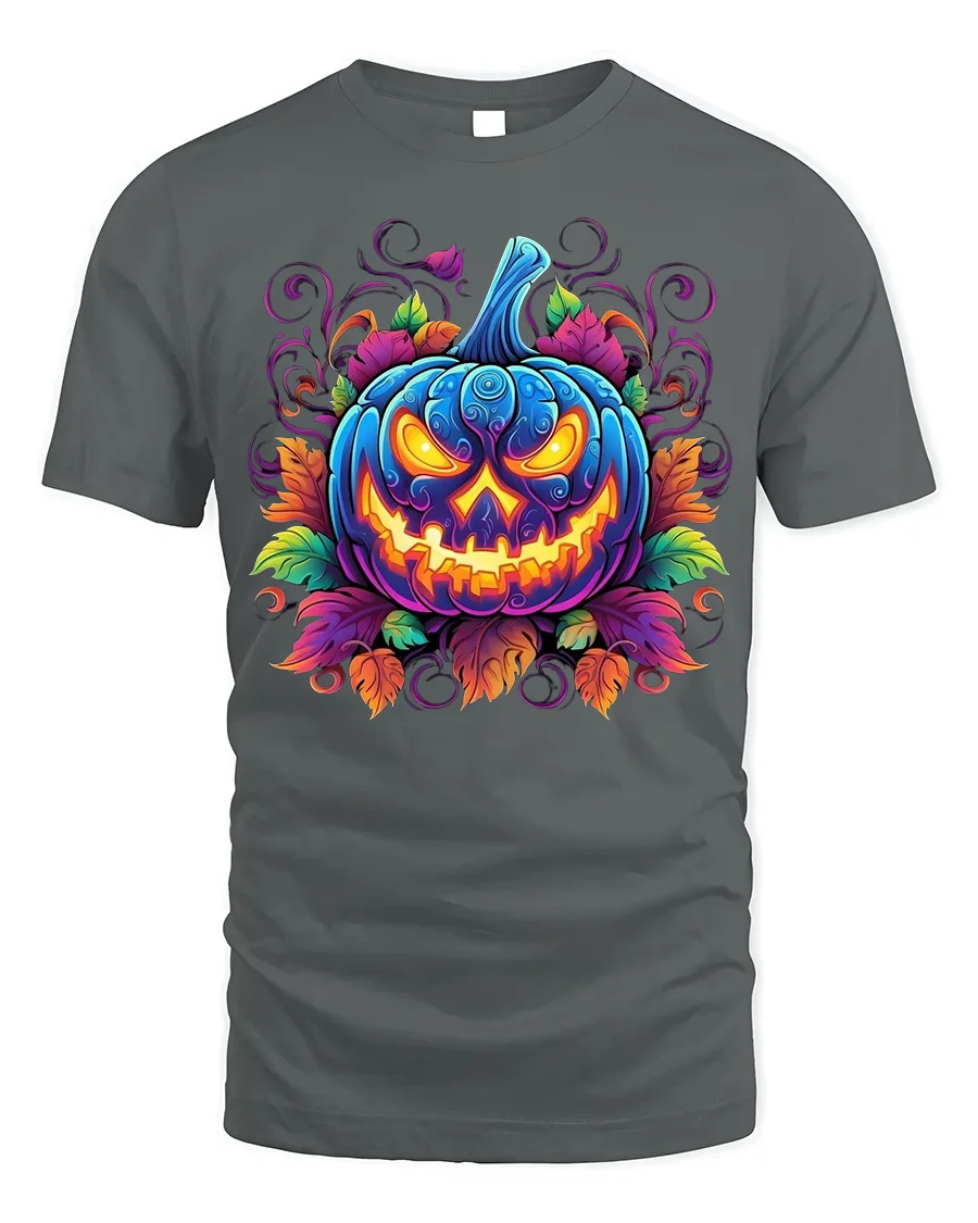 Light up your spooky season with the Halloween Neon Blue Pumpkin Glow T-Shirt. Featuring a striking jack-o’-lantern design in glowing neon blue and fiery orange, surrounded by swirling leaves and vibrant colors, this graphic tee brings a modern twist to traditional Halloween style. The bold design makes it perfect for fans of unique and eye-catching holiday apparel.