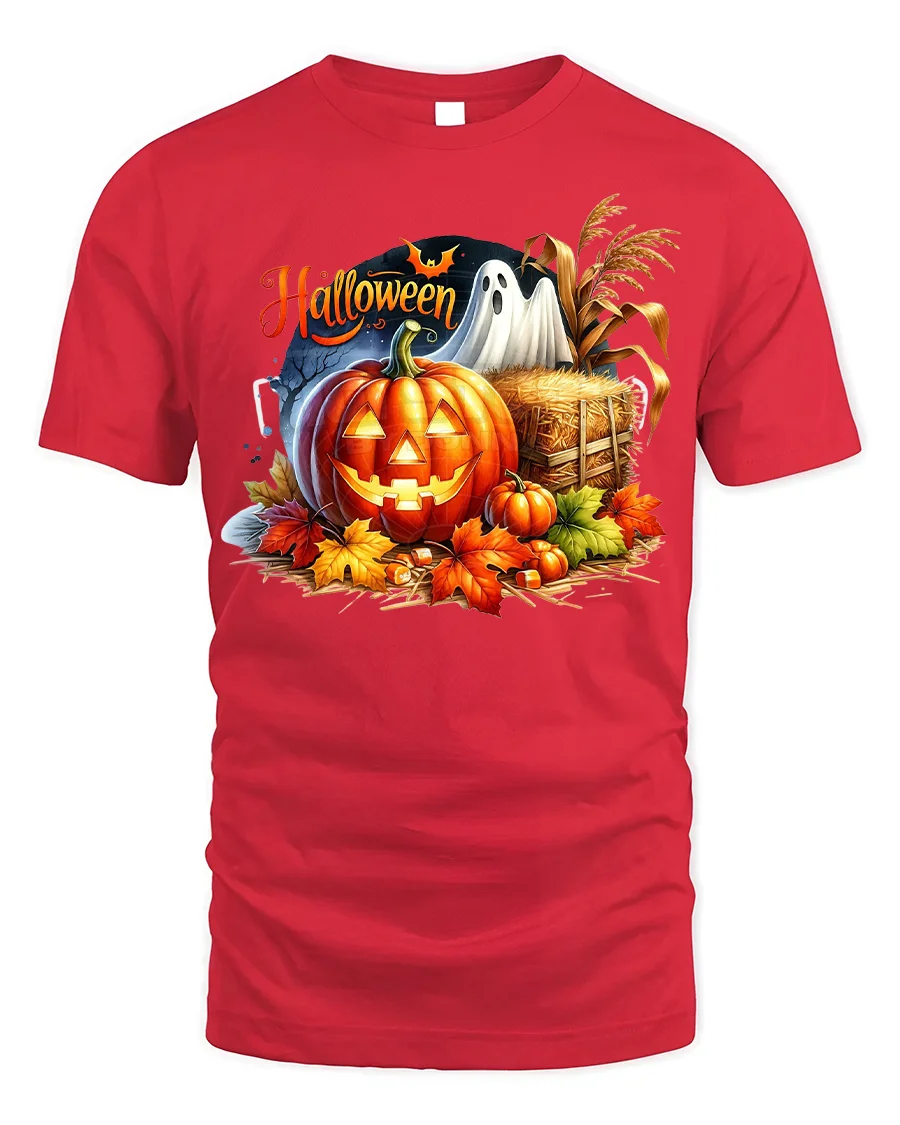 Celebrate the spooky season in style with this Halloween Pumpkin Ghost Scene Graphic T-Shirt, designed to capture the magic and mystery of Halloween night. Featuring a glowing jack-o-lantern surrounded by autumn leaves, haystacks, and a friendly ghost, this festive design brings together all the classic elements that make October nights so special. Whether you’re trick-or-treating, attending a haunted house event, or enjoying a cozy fall gathering, this Halloween tee is the perfect way to showcase your seasonal spirit.