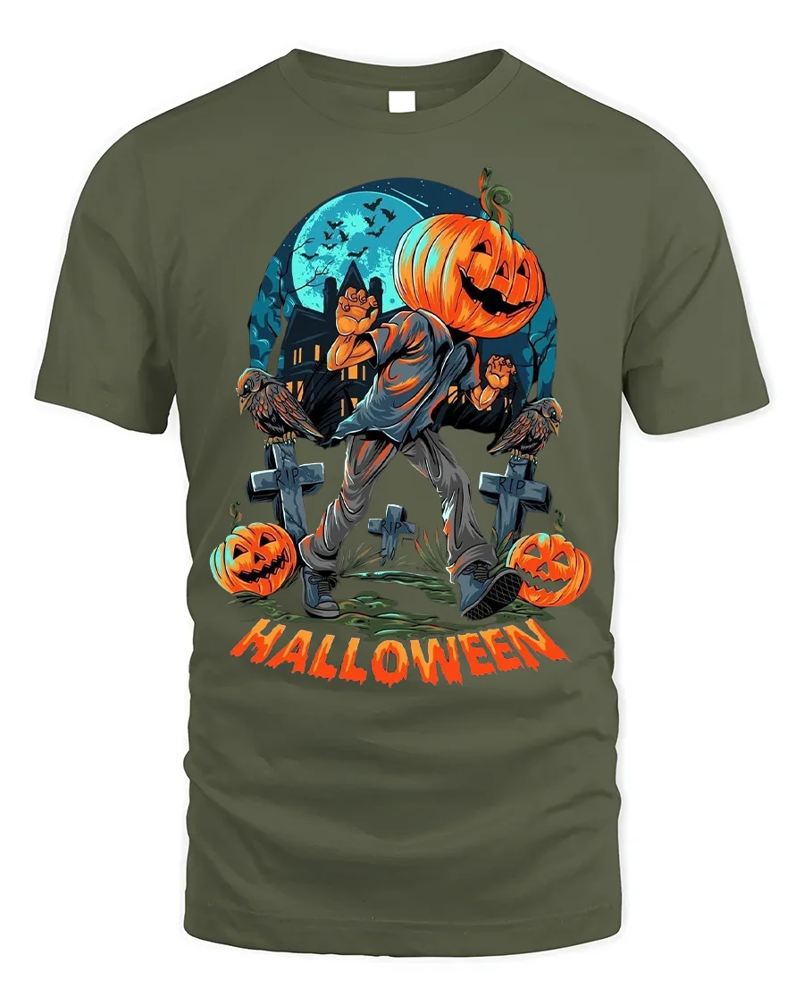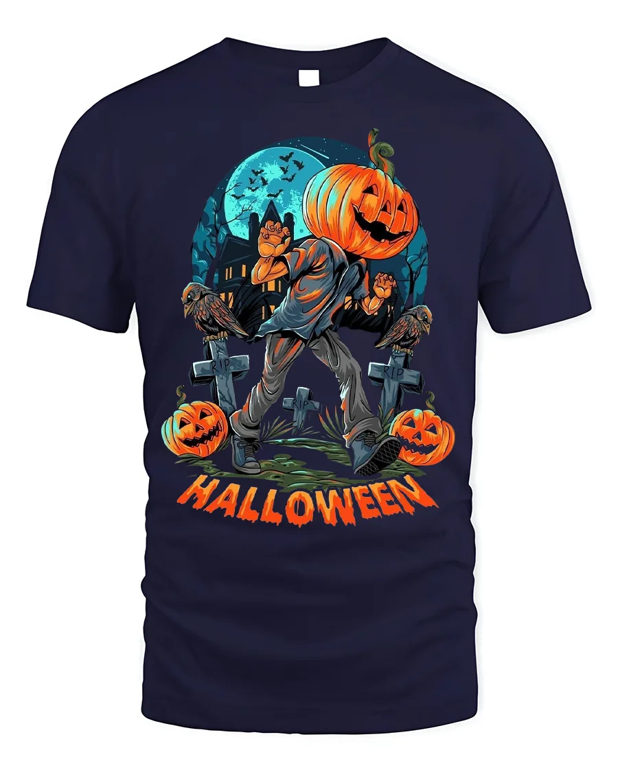 This t-shirt features a frightening pumpkin head character rising in a graveyard under the full moon, with glowing jack-o’-lanterns and eerie details.