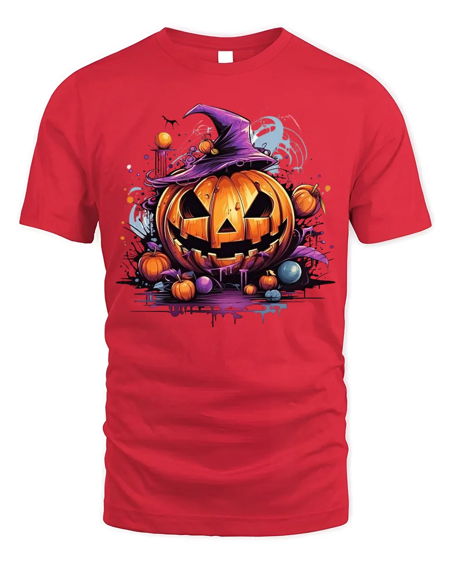 Made from quality material for comfort and durability, this Halloween pumpkin t-shirt is ideal for costume parties, trick-or-treating, haunted house visits, or simply enjoying autumn nights in style. The vibrant orange pumpkin artwork against the dark fabric creates a striking contrast that stands out wherever you go, while the witch hat and spooky accents add that extra festive flair.