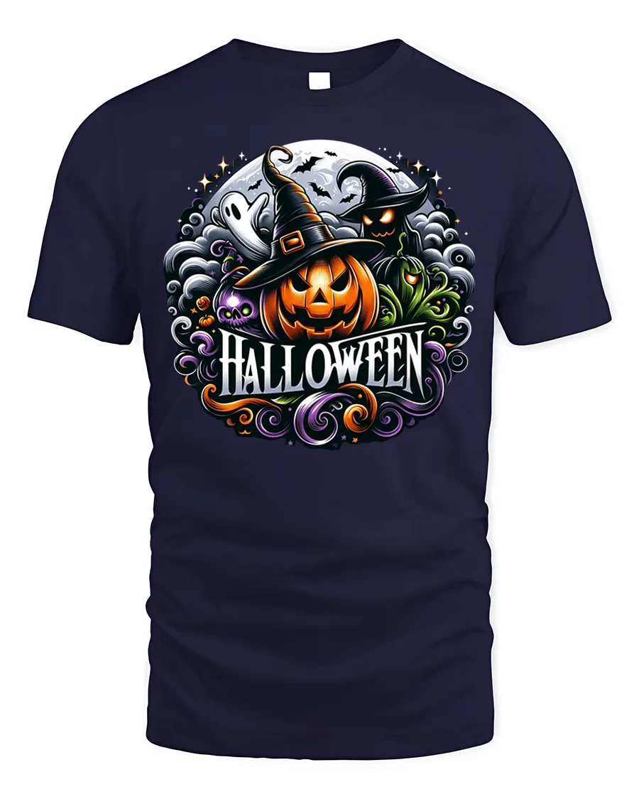 Celebrate the spooky season in style with the Halloween Pumpkin Witch T-Shirt Spooky Ghost Design. This festive tee features a grinning jack-o’-lantern wearing a witch’s hat, surrounded by swirling details, playful ghosts, and a glowing full moon backdrop. The bold “Halloween” text completes the design, making it a perfect shirt for anyone who loves the thrills and chills of October nights.