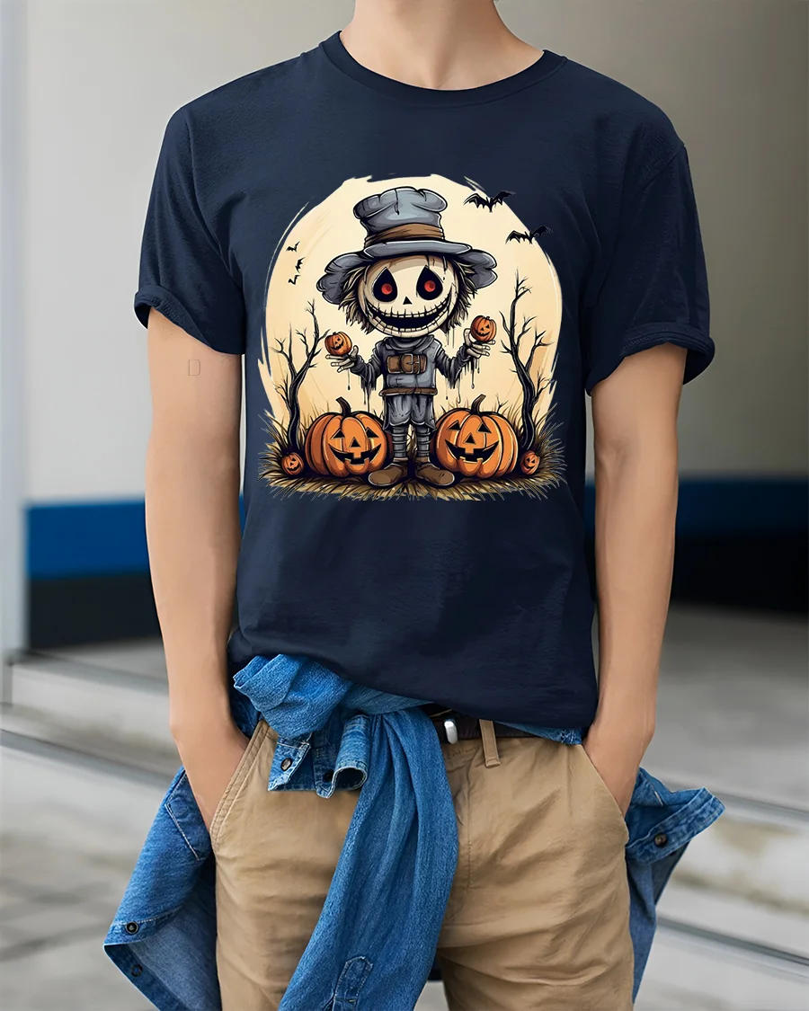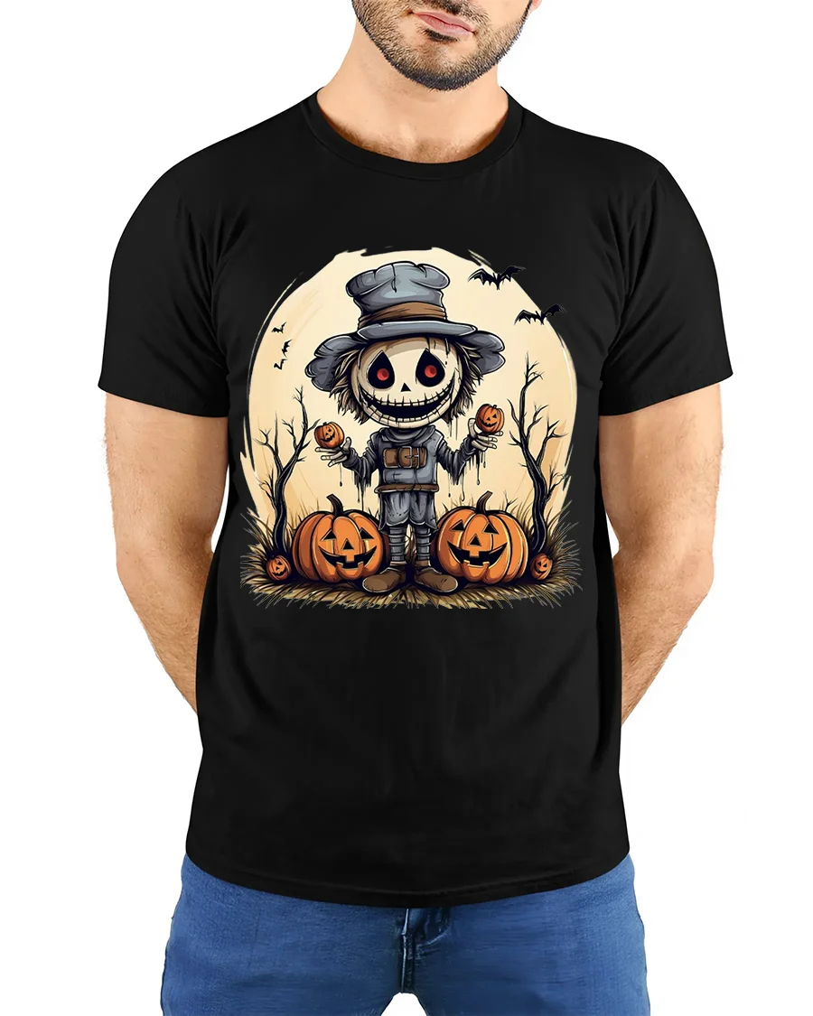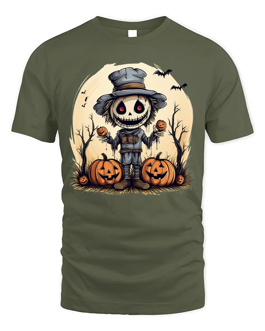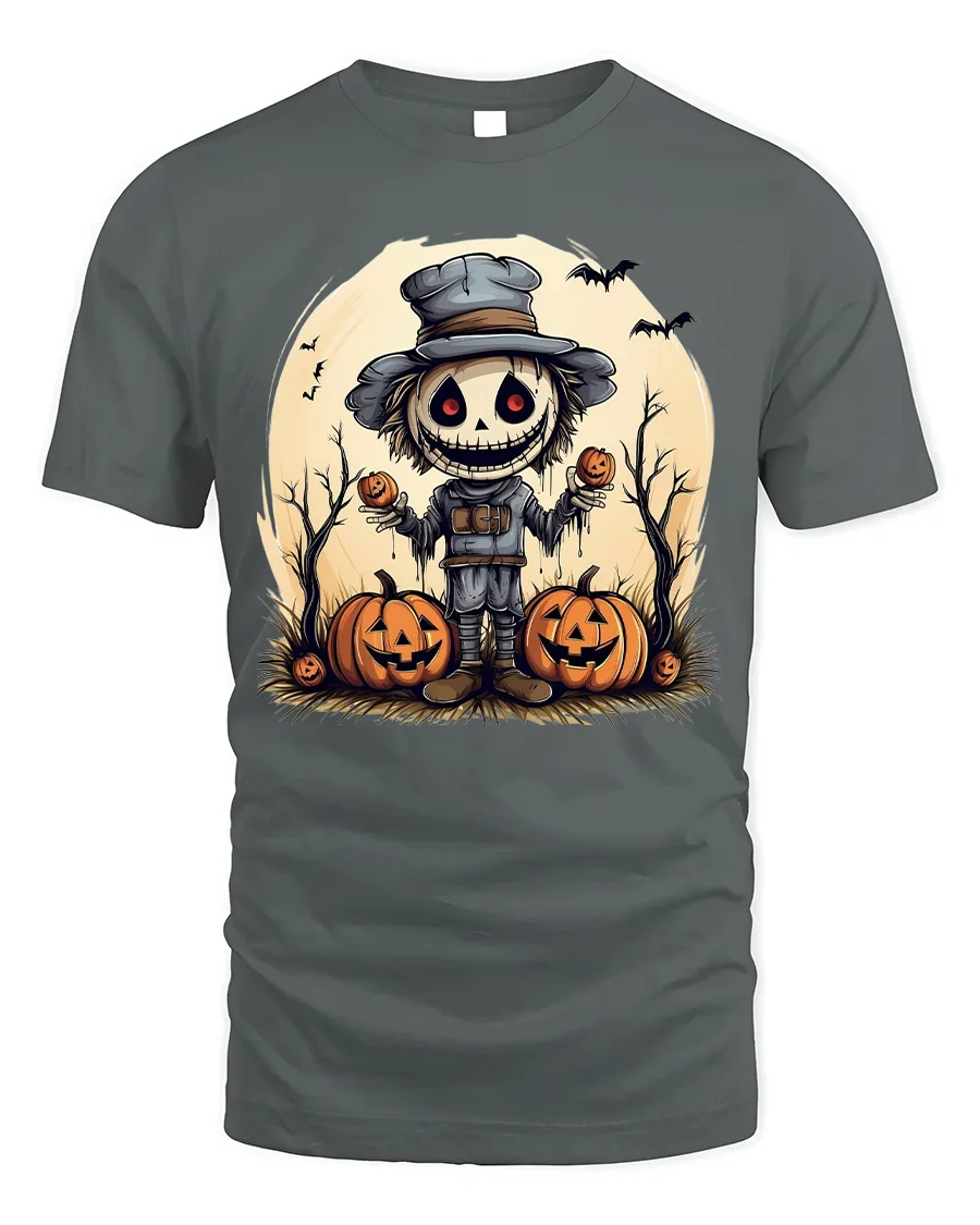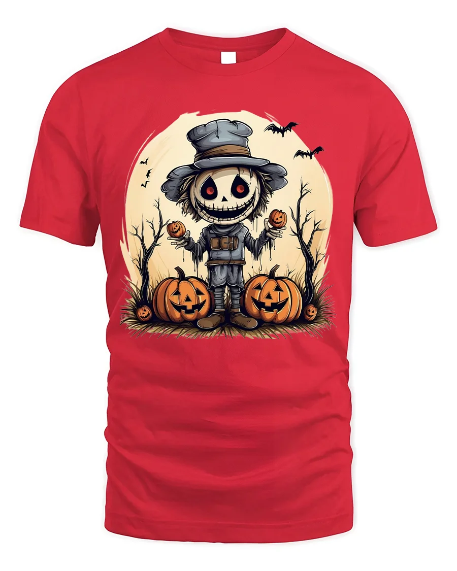 This shirt features a spooky scarecrow with a stitched grin, glowing eyes, and jack-o’-lanterns all around in a dark autumn setting.