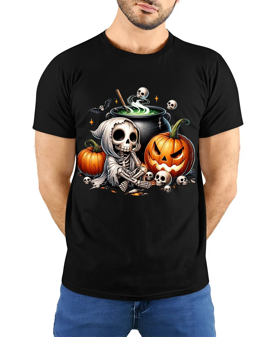 Bring a chilling yet playful vibe to your spooky season style with the Halloween Skeleton Cauldron Pumpkin T-Shirt. This unique design features a hooded skeleton sitting among glowing pumpkins and eerie skulls, with a bubbling witch’s cauldron brewing in the background. Bats and dark accents add the finishing touch to this hauntingly fun Halloween graphic.