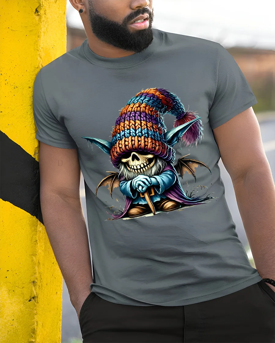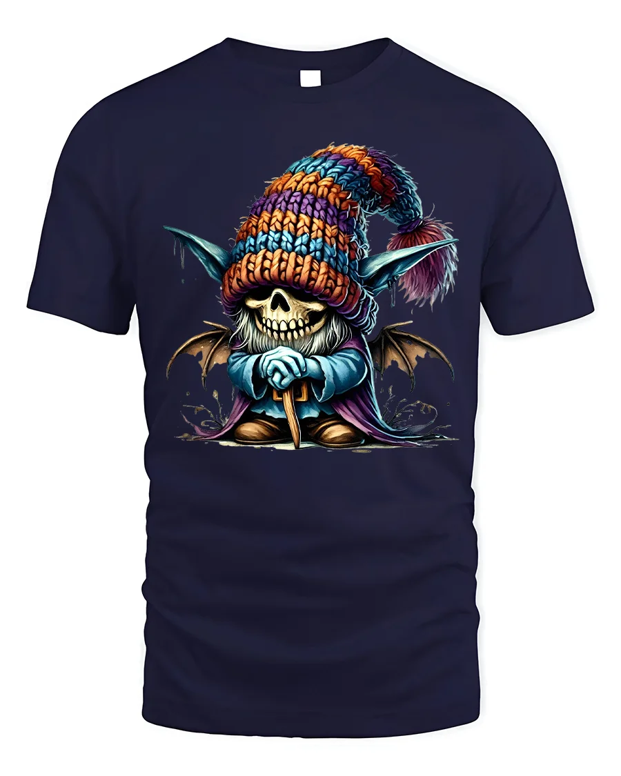 Add a mix of creepy and quirky to your wardrobe with the Halloween Skeleton Gnome Colorful Hat T-Shirt. Featuring a sinister skeleton dressed like a gnome with bat wings, a cane, and a vibrant knitted hat, this shirt combines spooky Halloween vibes with playful fantasy style. The mix of bright colors and dark gothic elements makes it a unique design that stands out for the season.