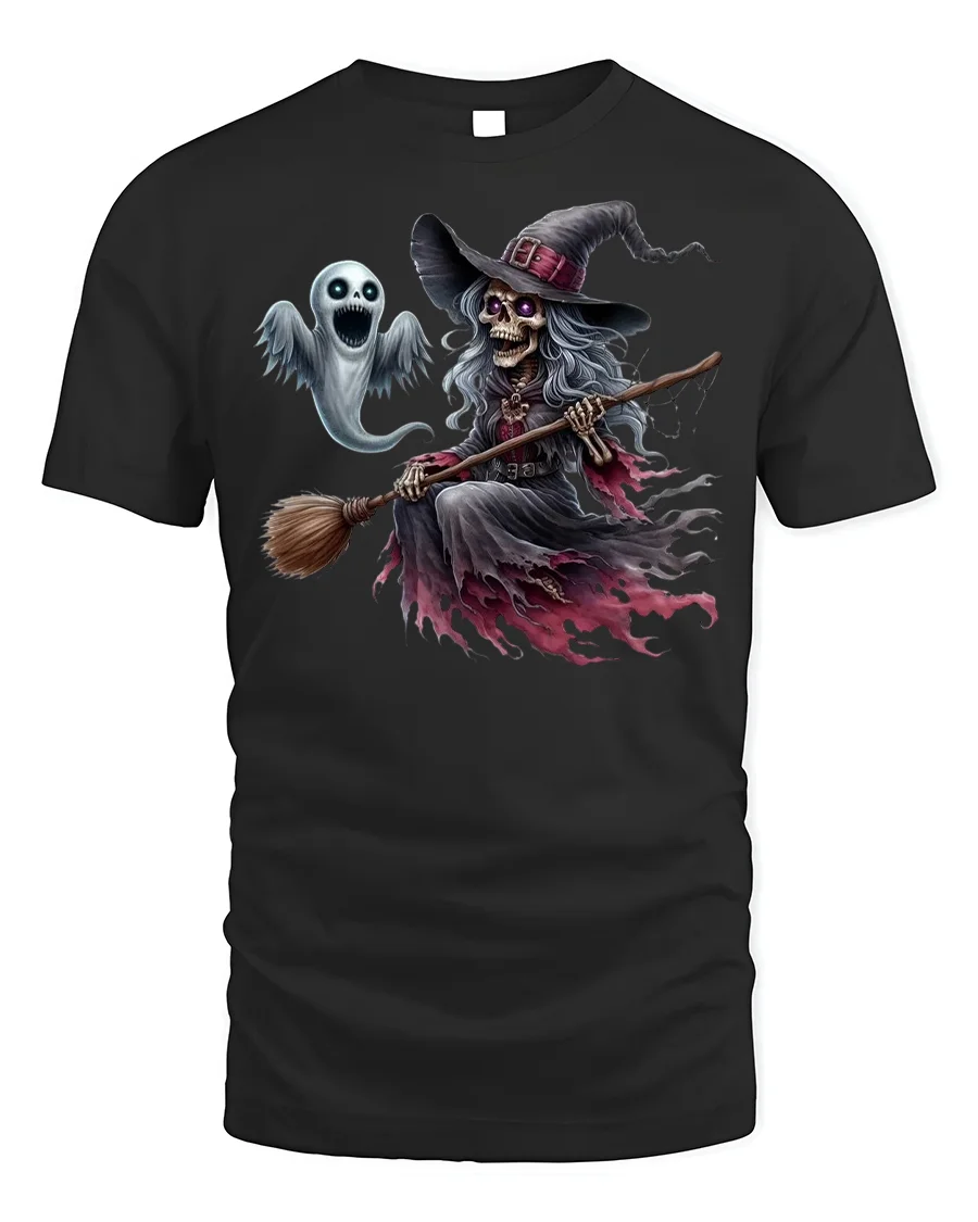 This shirt features a terrifying skeleton witch with glowing eyes riding a broomstick, accompanied by a spooky ghost in the night sky.
