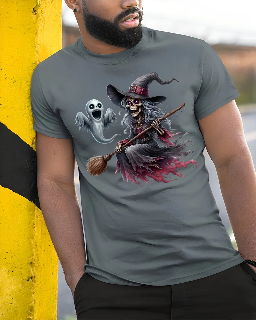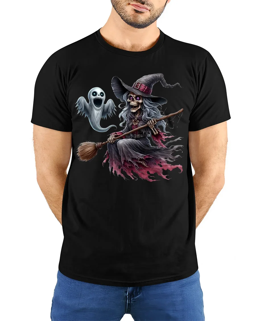 Halloween Skeleton Witch Ghost Flying Graphic T-Shirt is the perfect choice for fans of creepy and gothic Halloween designs.