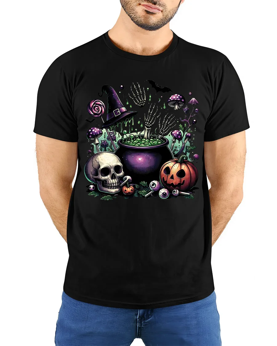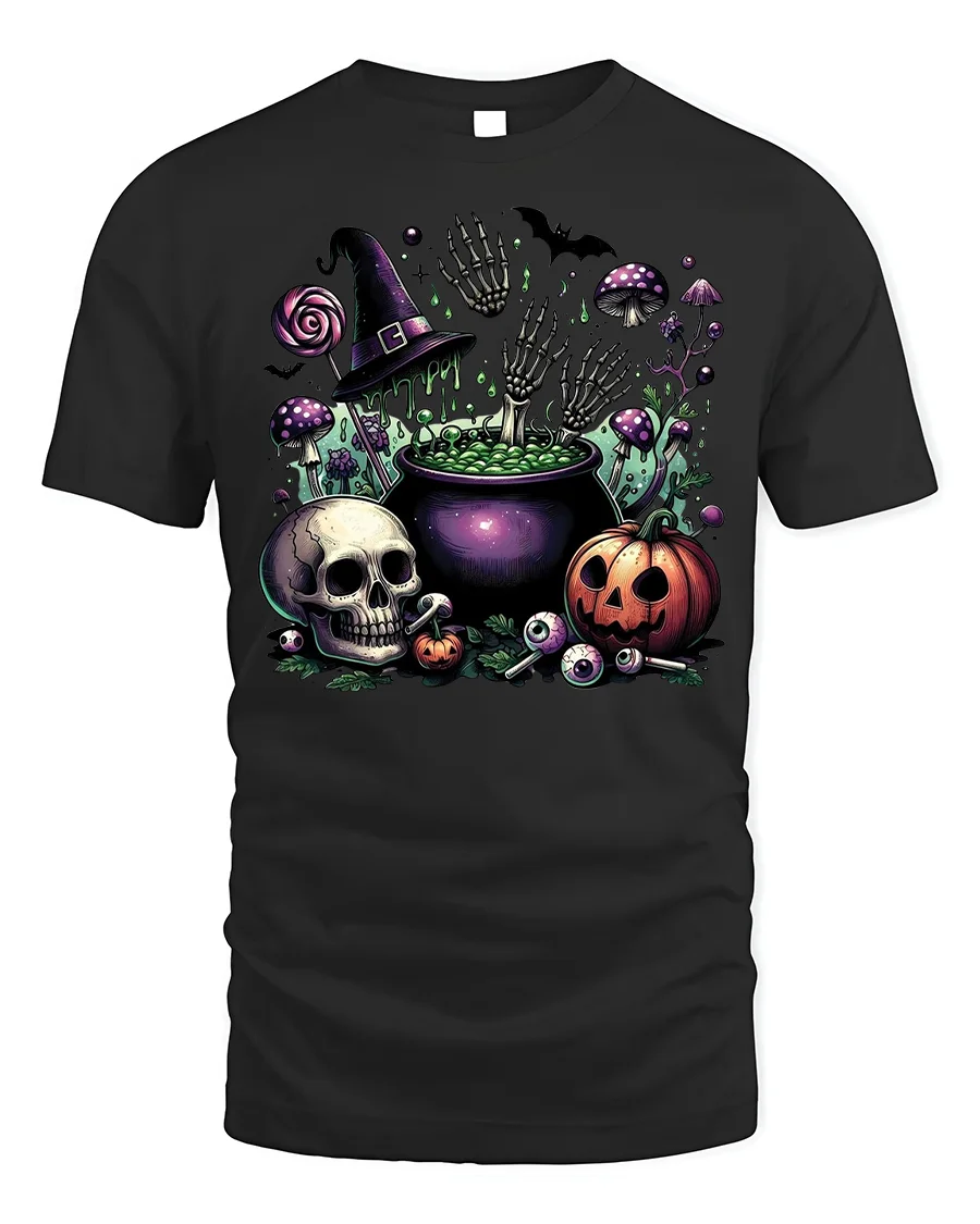 Get ready to turn heads this spooky season with the Halloween Skull Pumpkin Cauldron T-Shirt Creepy Fun – the perfect blend of creepy and festive design. This striking tee showcases a bubbling witch’s cauldron with skeleton hands rising out, surrounded by eerie details like a glowing skull, jack-o’-lantern, bats, mushrooms, and scattered eyeballs. Topped with a witch hat and candy touches, it captures everything you love about Halloween in one bold graphic.