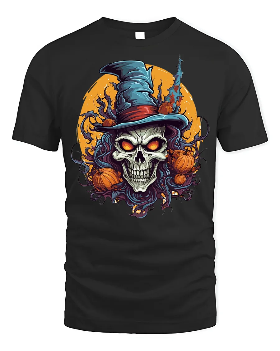 Bring the perfect mix of spooky and bold to your wardrobe with the Halloween Skull Witch T-Shirt with Pumpkins and Moon. This eerie design features a sinister skull with glowing eyes, topped with a witch’s hat and framed by swirling details, pumpkins, and a glowing orange moon. It’s a striking design that captures the essence of Halloween night.