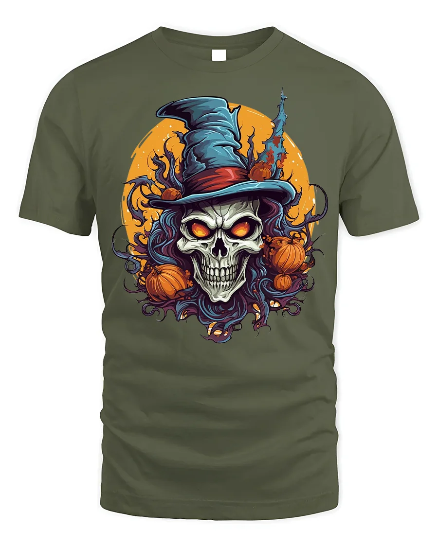 The Halloween Skull Witch T-Shirt with Pumpkins and Moon is also a fantastic gift idea for fans of horror, gothic fashion, and Halloween-inspired art. Whether you wear it as a statement piece or layer it with your favorite fall jacket, this tee is versatile and perfect for October nights. Add it to your collection today and bring a haunting edge to your Halloween celebrations.