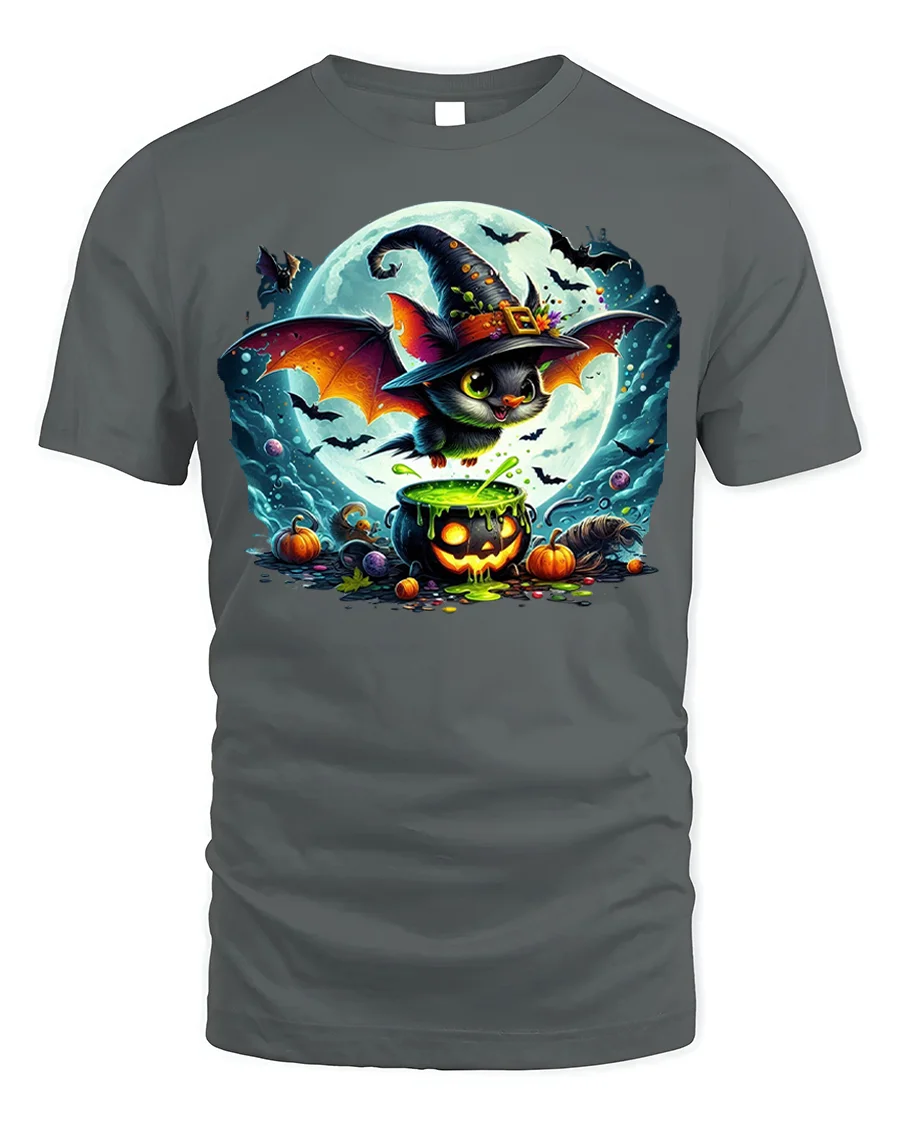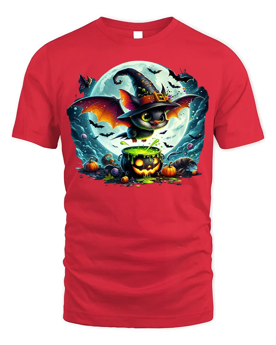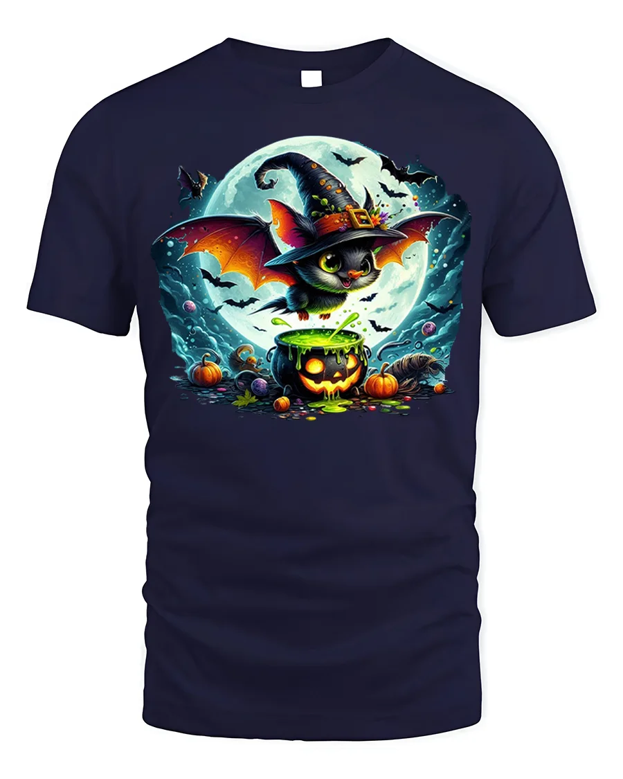 The Halloween Witch Bat Cauldron Moon T-Shirt is a bold and enchanting design that captures the true spirit of Halloween. Featuring a wide-eyed bat with glowing wings and a witch hat flying across a full moon, the scene is completed by a bubbling cauldron with a jack-o’-lantern face, surrounded by pumpkins, candy, and eerie details. This graphic tee is the perfect mix of spooky, magical, and playful, making it a standout choice for Halloween lovers.