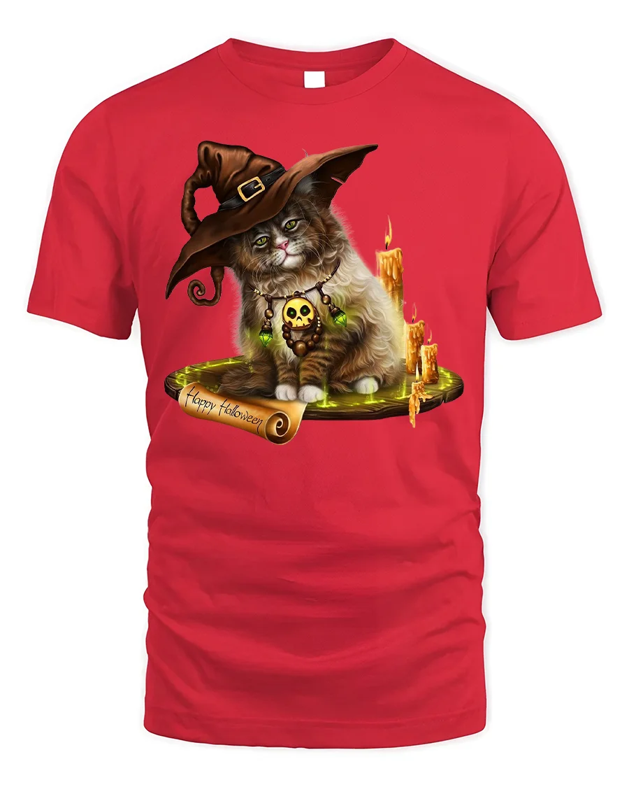 This t-shirt features a detailed design of a mystical cat wearing a witch hat, surrounded by glowing candles and enchanting accessories.