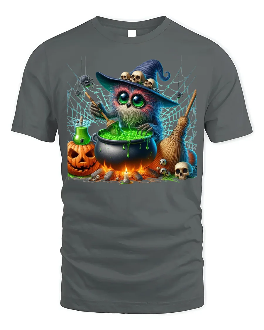 Stir up some spooky fun with the Halloween Witch Owl Cauldron Magic T-Shirt. This eye-catching design features a wide-eyed owl dressed as a witch, complete with a classic hat, perched over a bubbling green cauldron. Surrounded by pumpkins, skulls, spider webs, and a broomstick, this graphic tee captures all the eerie charm of Halloween in one playful scene.