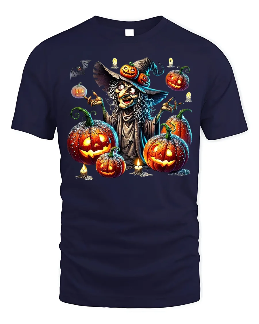 This shirt features a creepy witch surrounded by glowing jack-o’-lantern pumpkins, eerie bats, and candlelight details.