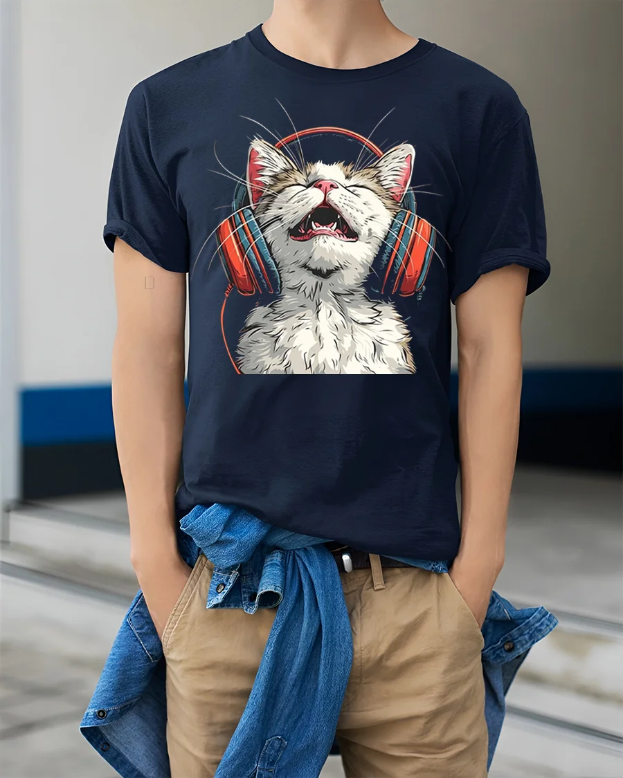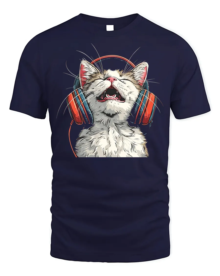 Turn up the fun in your wardrobe with the Happy Cat Headphones Music Lover Graphic T-Shirt. Featuring a cheerful cat enjoying music with oversized headphones, this design is perfect for anyone who loves pets and music. The playful illustration captures pure joy, making it a standout tee that combines feline charm with musical vibes.