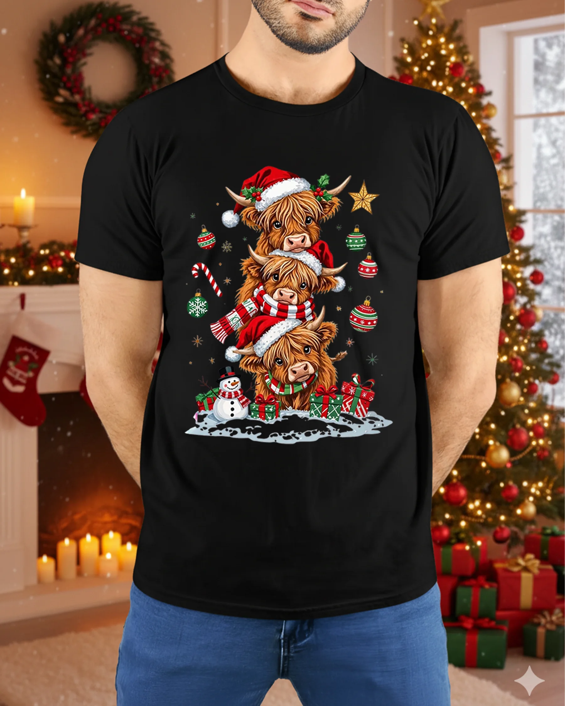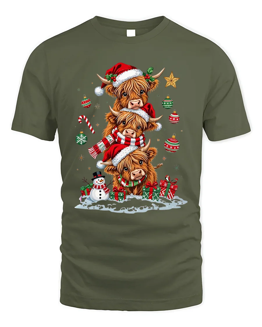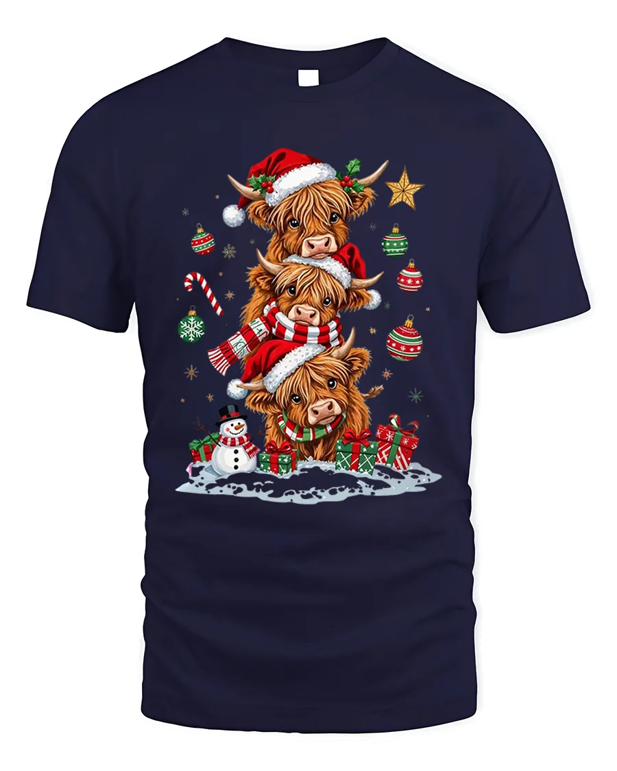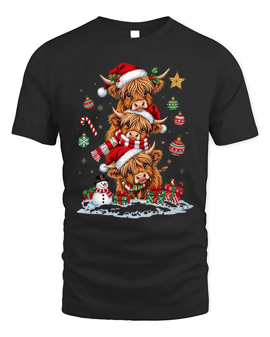 Celebrate the magic of the holidays with our Highland Cow Family Christmas Santa Hat Holiday T-Shirt. This heartwarming design features three adorable Highland cows stacked together, dressed in Santa hats and scarves, surrounded by gifts, ornaments, and a cheerful snowman. It’s the perfect mix of rustic charm and Christmas spirit, bringing a smile to every animal lover’s face.