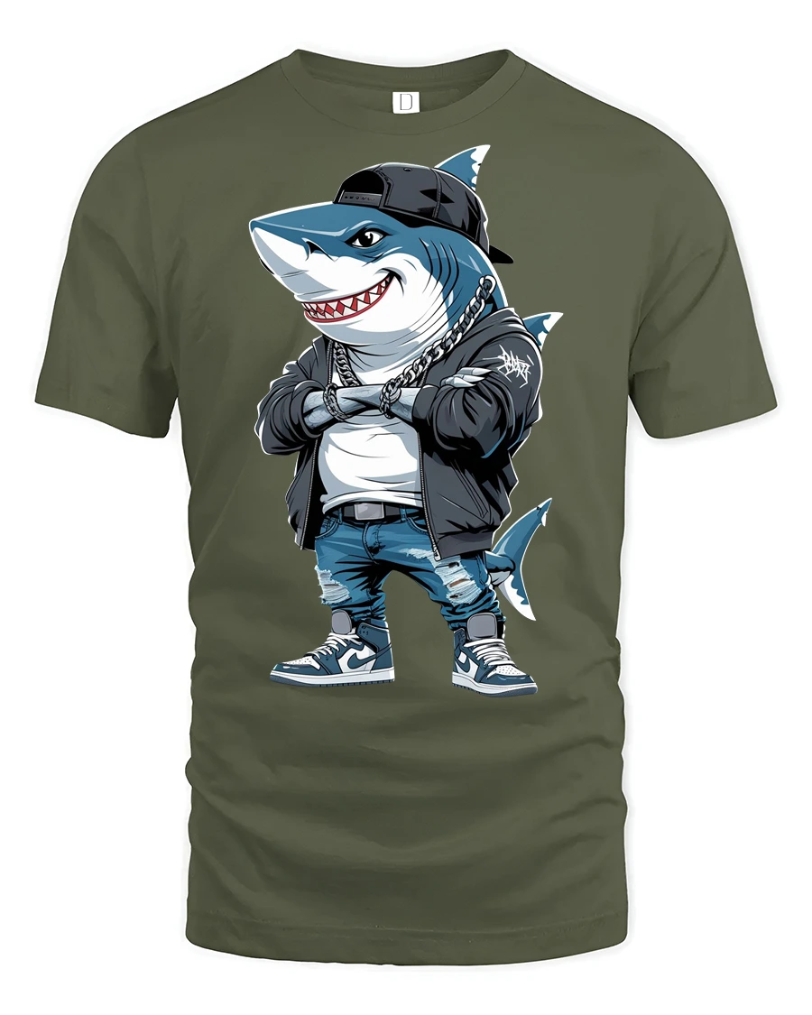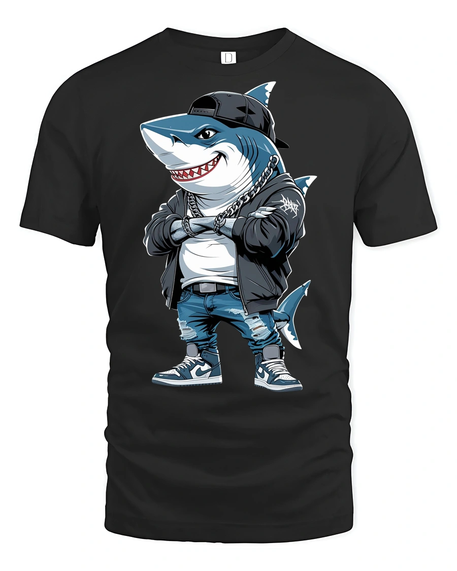 The stylish shark rocking a cap, chains, and urban outfit creates a confident and eye catching look that stands out instantly.