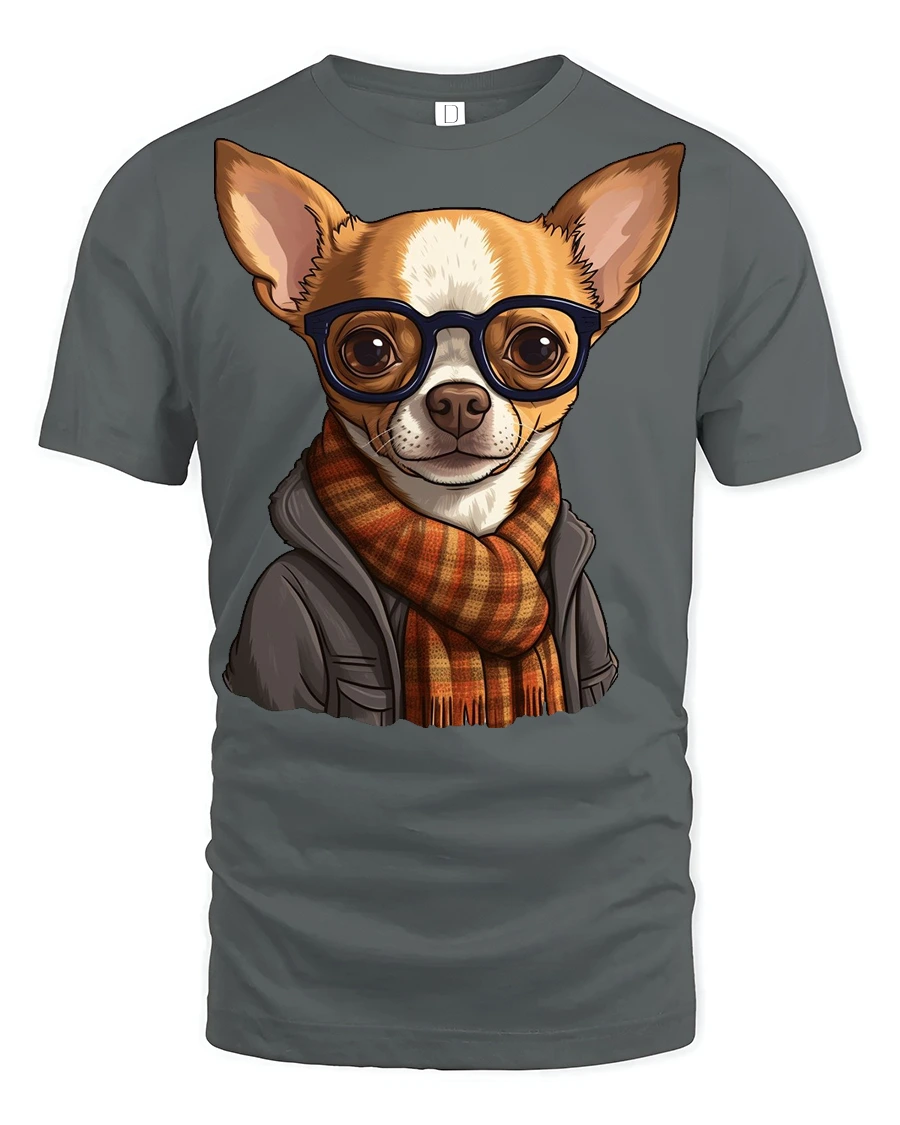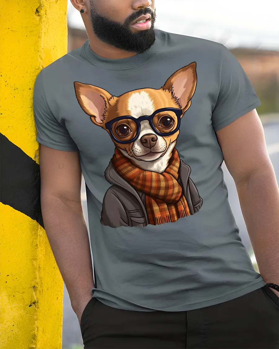 Hipster Chihuahua Dog With Glasses Scarf Graphic T Shirt Cute Pet Tee features an adorable and stylish chihuahua dressed in trendy accessories.