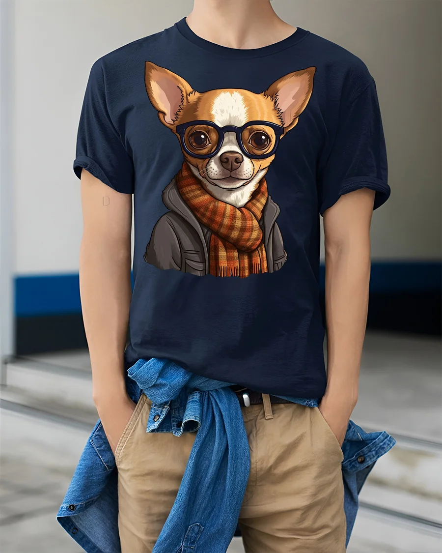 Hipster Chihuahua Dog With Glasses Scarf Graphic T Shirt Cute Pet Tee - model wearing navy tee with hands in pockets