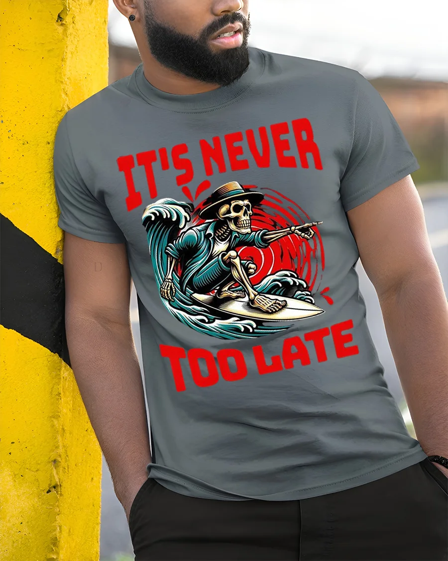 Whether you’re a surfer, a skeleton art fan, or someone who just enjoys unique novelty t-shirts, this design is sure to get attention. Pair it with shorts, jeans, or layered outfits for a versatile look that works anywhere. The It’s Never Too Late Skeleton Surfer Graphic T-Shirt is more than a shirt—it’s a lifestyle statement that says adventure never ends.