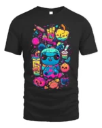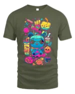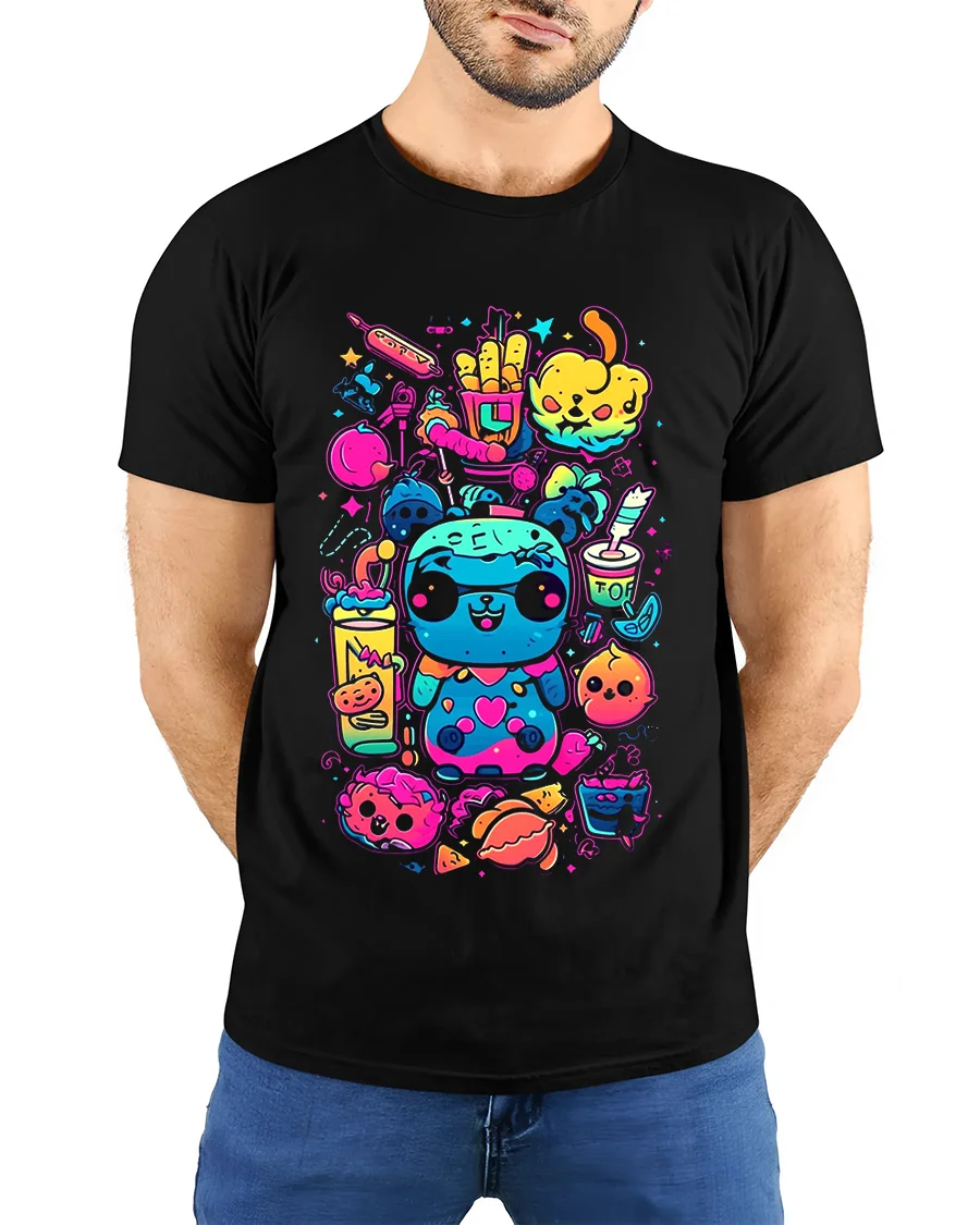 Made from soft, breathable fabric, this cute graphic t-shirt keeps you comfortable all day long while maintaining durability through repeated wear and washing. The high-quality print ensures that every charming detail—from the smiling snacks to the glowing neon accents—remains vivid and sharp over time. This tee is perfect for anyone who loves Japanese-inspired kawaii aesthetics, cartoon art, or colorful fashion that stands out.